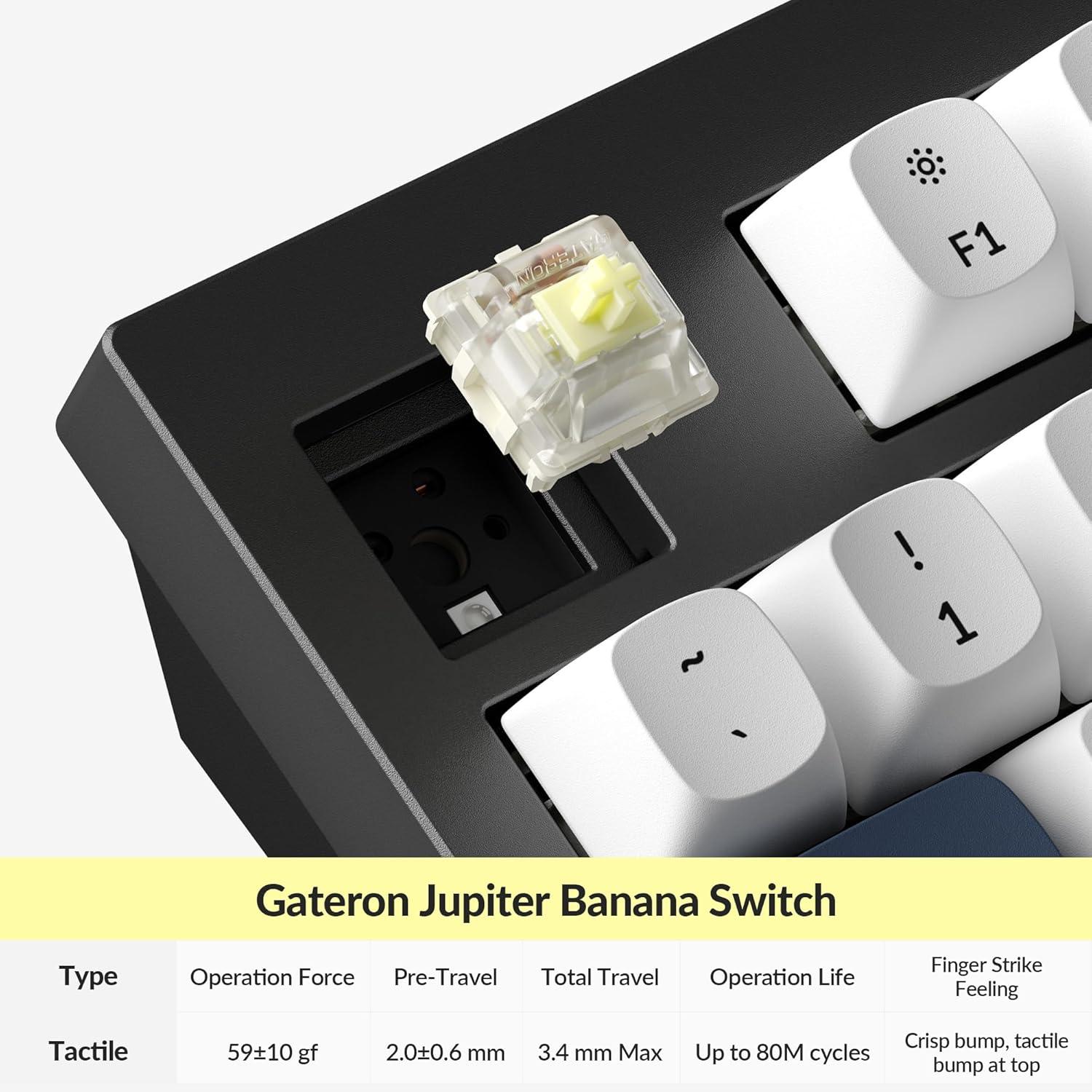 Tactile Banana Switch: The Gateron Jupiter Banana switch delivers earlier tactile bumps and stronger feedback than typical brown switches. A two-stage spring ensures a responsive return and consistent feel.