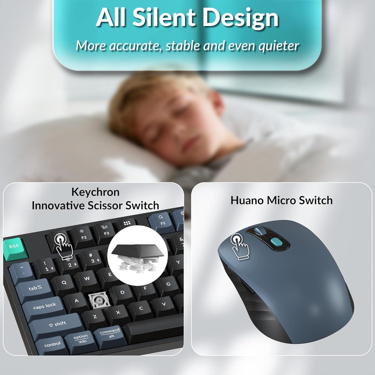 Silent Typing and Click: The B33 keyboard features keychron innovative scissor switch that is 59% taller than the standard ones, leading to a more accurate, stable and even quieter keystroke. Equipped with all-silent micro switches, the BM25 ensures ultra-quiet clicks—perfect for shared spaces, office work, or late-night gaming.