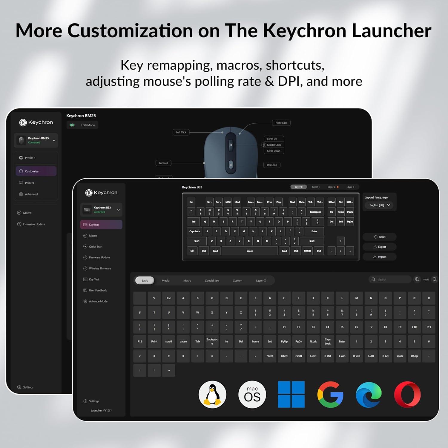 Customization on The Keychron Launcher: Unlock limitless customization with the Keychron Launcher web app, enabling easy key remapping, macros and more. Or, further adjust mouse's polling rate, DPI without software downloads. It provides 5 on-board memory profiles for your access to different apps or computers.