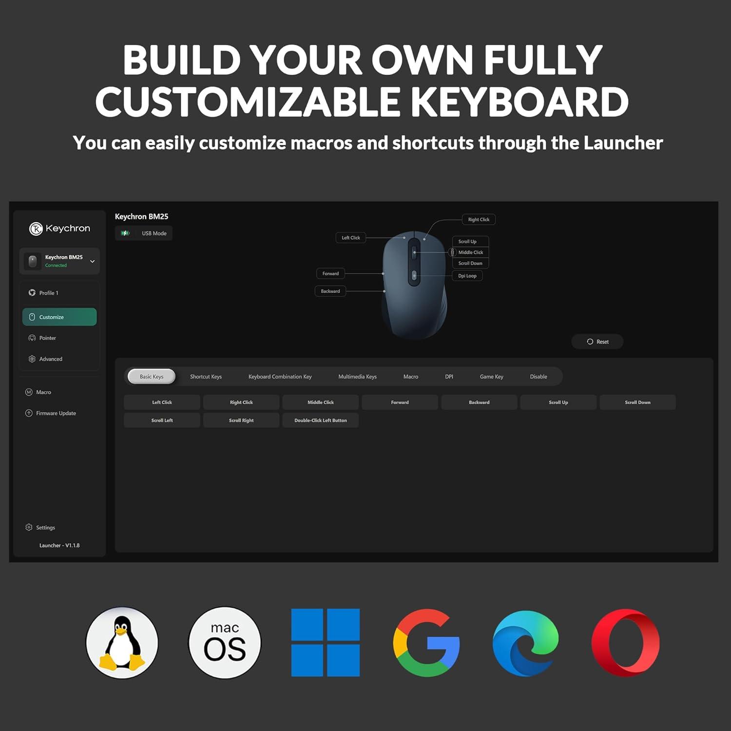 Customize Your Controls – Keychron Launcher puts advanced customization at your fingertips, enabling you to remap keys, program macros, and fine-tune settings like DPI and polling rates. Its intuitive design allows you to effortlessly build a personalized workflow for gaming, design, or professional applications.