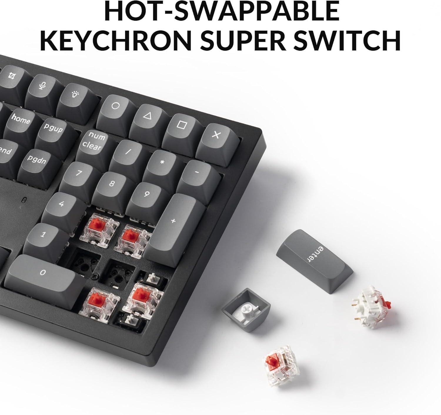 Hot-Swappable: Features Keychron Super switches, its new light affection structure on its transparent top housing also ensures high light transmittance and a more consistent, brighter backlight effect. You can hot-swap the switches without soldering according to your preferences