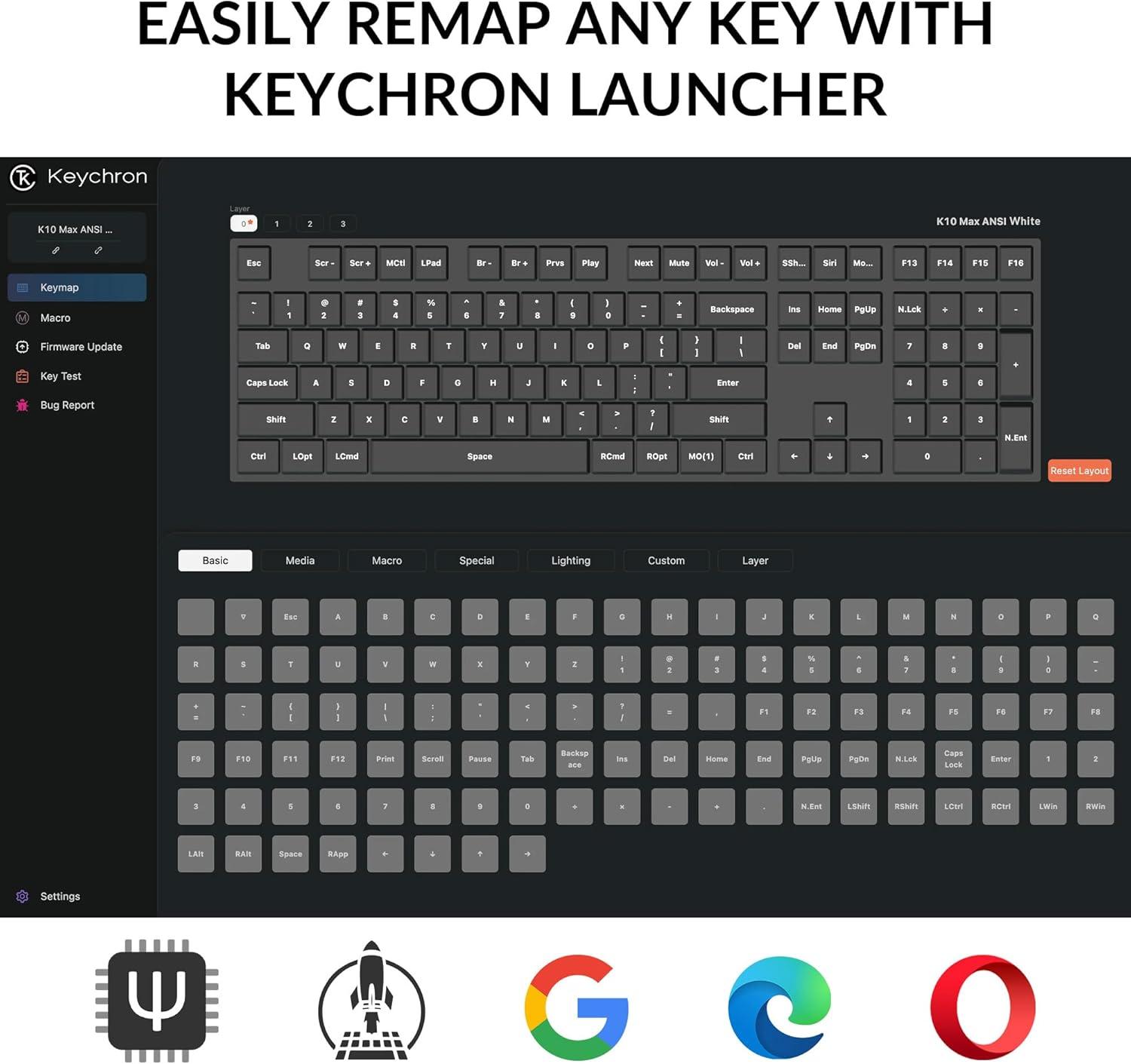Open-Source Firmware & Launcher App: Running on QMK open-source firmware, the K10 Max ensures transparency and security. With the Keychron Launcher, a cross-platform, web-based tool, access regular updates and new features for an optimized experience