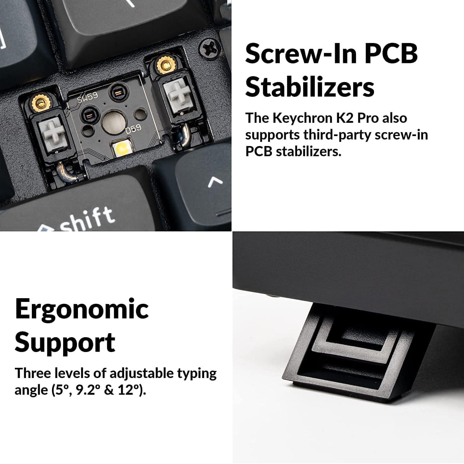 Pre-lubed Keychron K Pro Switch – With the fully assembled K10 Pro version fitted with factory pre-lubricated Keychron K Pro switches, a smoother travel experience is guaranteed for you. The PCB-mounted screw-in stabilizer for “big keys” such as space bar, shift, enter, and delete are designed for less wobbliness and smooth performance.