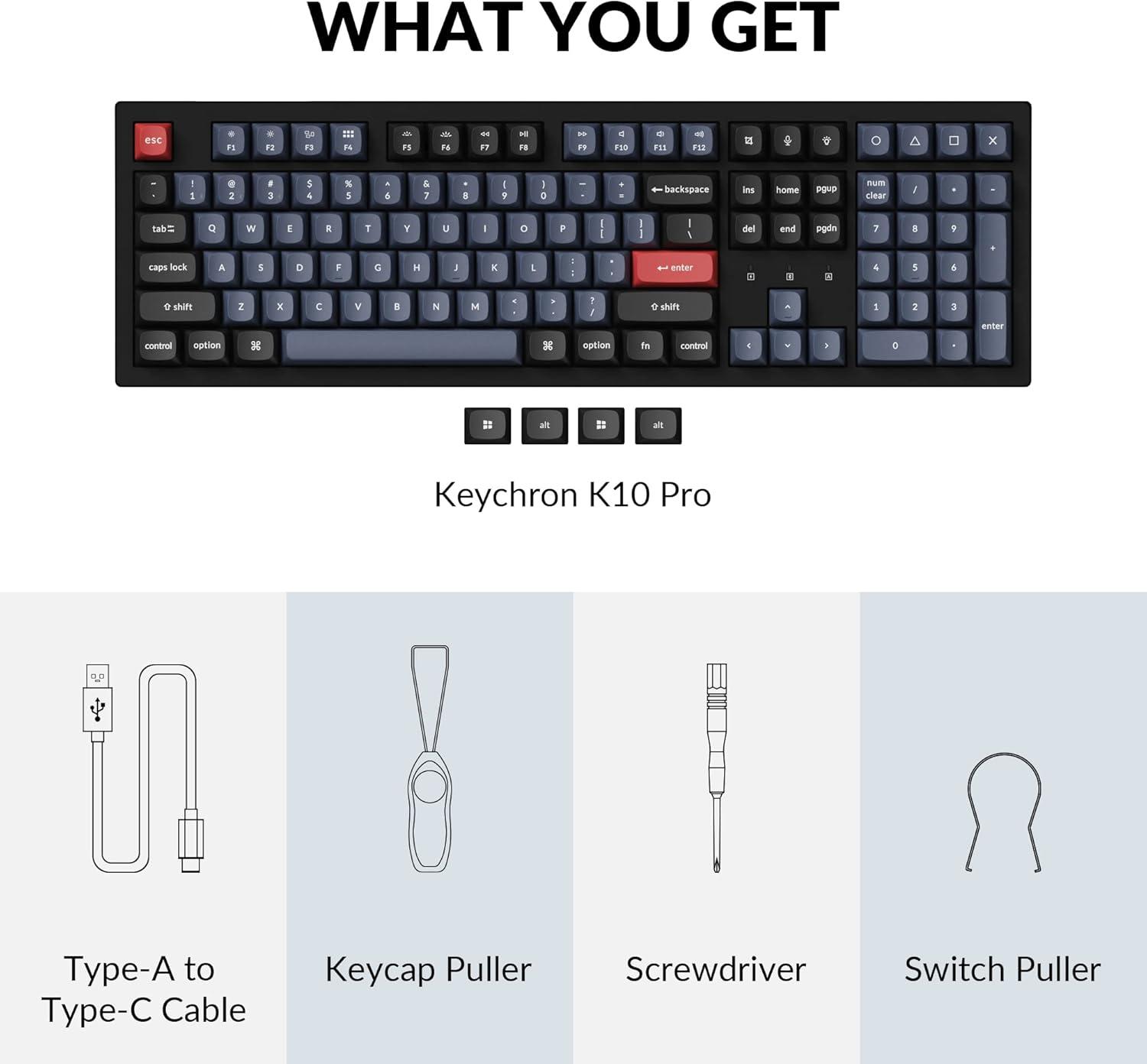 100% Layout Mechanical Keyboard: Keychron K10 Pro is a premium full-size wireless mechanical keyboard. The K10 Pro has been re-engineered from the inside out to upgrade the typing experience. It allows anyone to master any keyboard keys or macro commands through VIA and users can hot-swap with any MX mechanical switch in a breeze. The polling rate is 1000 Hz out of the box, which makes latency non-existent for the competitive game.