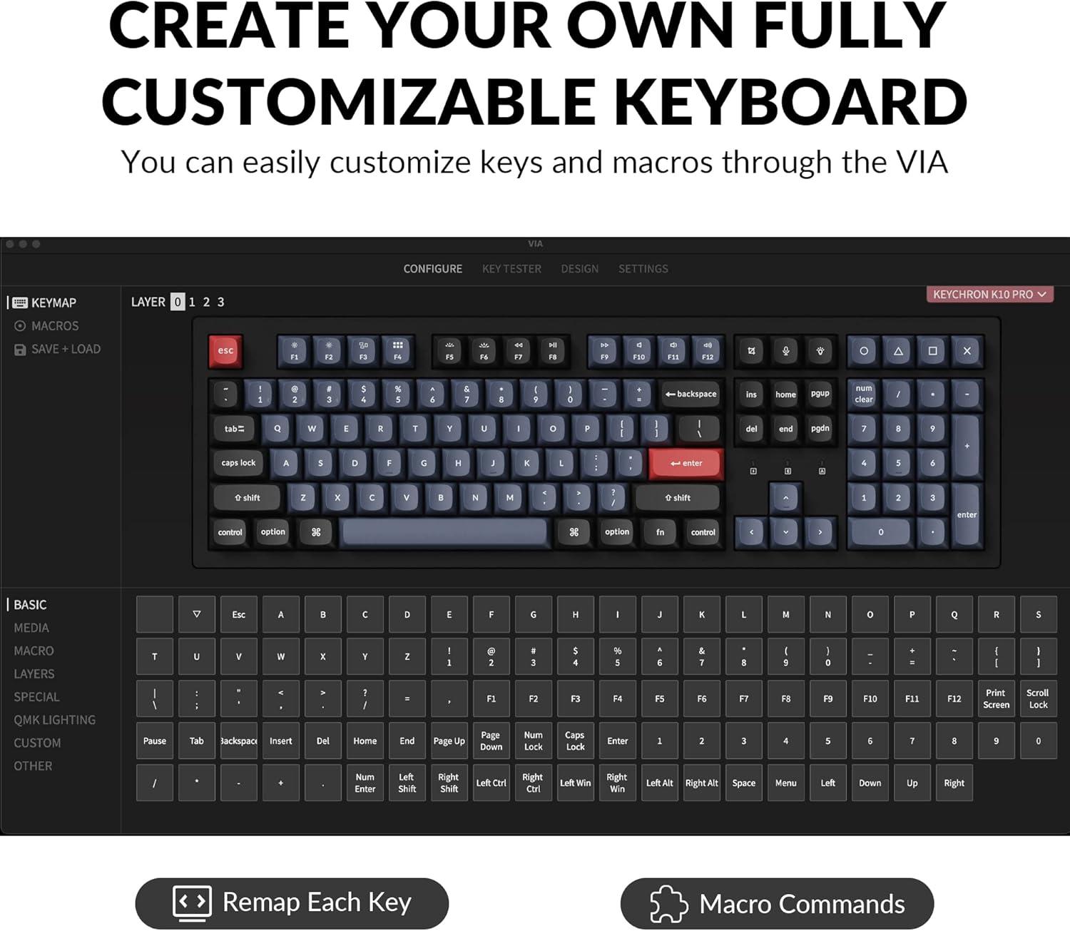 QMK/VIA Programmable: Keychron K10 Pro allows anyone to remap any key, and create macro commands, shortcuts, or combination keys through VIA. Simply connect the K10 Pro to your device with a cable, drag and drop your favorite keys or macro commands to remap any key you want on any system (macOS, Windows, or Linux). Note: User can remap a key on wired mode only. Once it's done, the keymap will work on both wireless and wired modes.