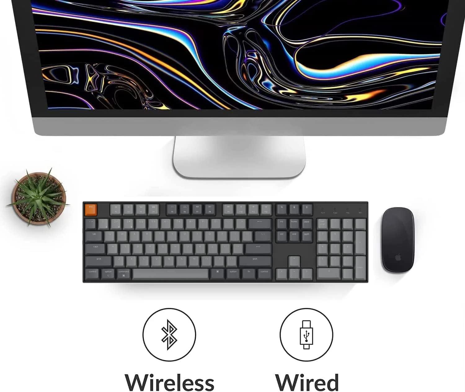 Keychron K10 is a full size layout (104-key) White backlight Bluetooth mechanical keyboard. The K10 is crafted to maximize your workspace and enhance productivity.The hot-swappable mechanical switches offers the freedom to easily personalize your typing experience without soldering.