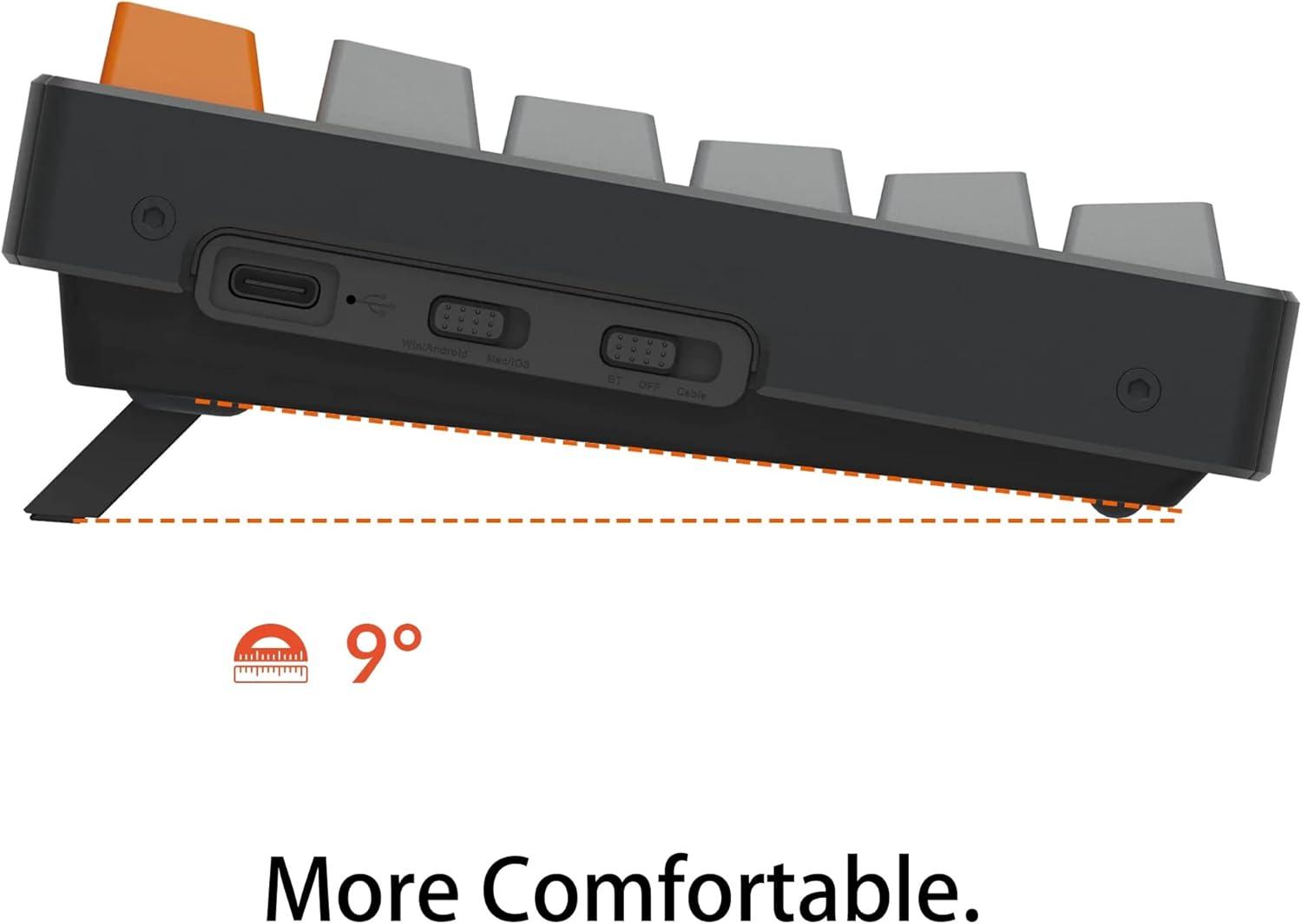 The K10 comes with a battery capacity of 4000mAh. The K10 can last up to 240 hours (with backlight off ), which is one of the biggest battery in mechanical keyboards. Two level adjustable feet (6º and 9º) and inclined bottom frame provides a great ergonomic support for long lasting typing comfort.
