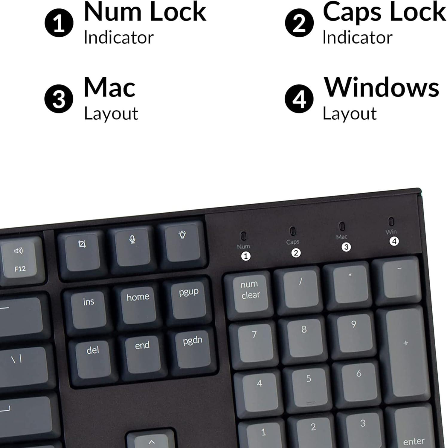 With a unique Mac layout, K10 has all necessary Mac function keys, while compatible with Windows. the K10 has all essential multimedia and function keys you need (Num Lock works with Windows only), and comes with a dedicated Screenshot Key, Siri (Cortana) Key, and Screen Lock Key. Extra keycaps for both Mac and Windows operating systems are included.