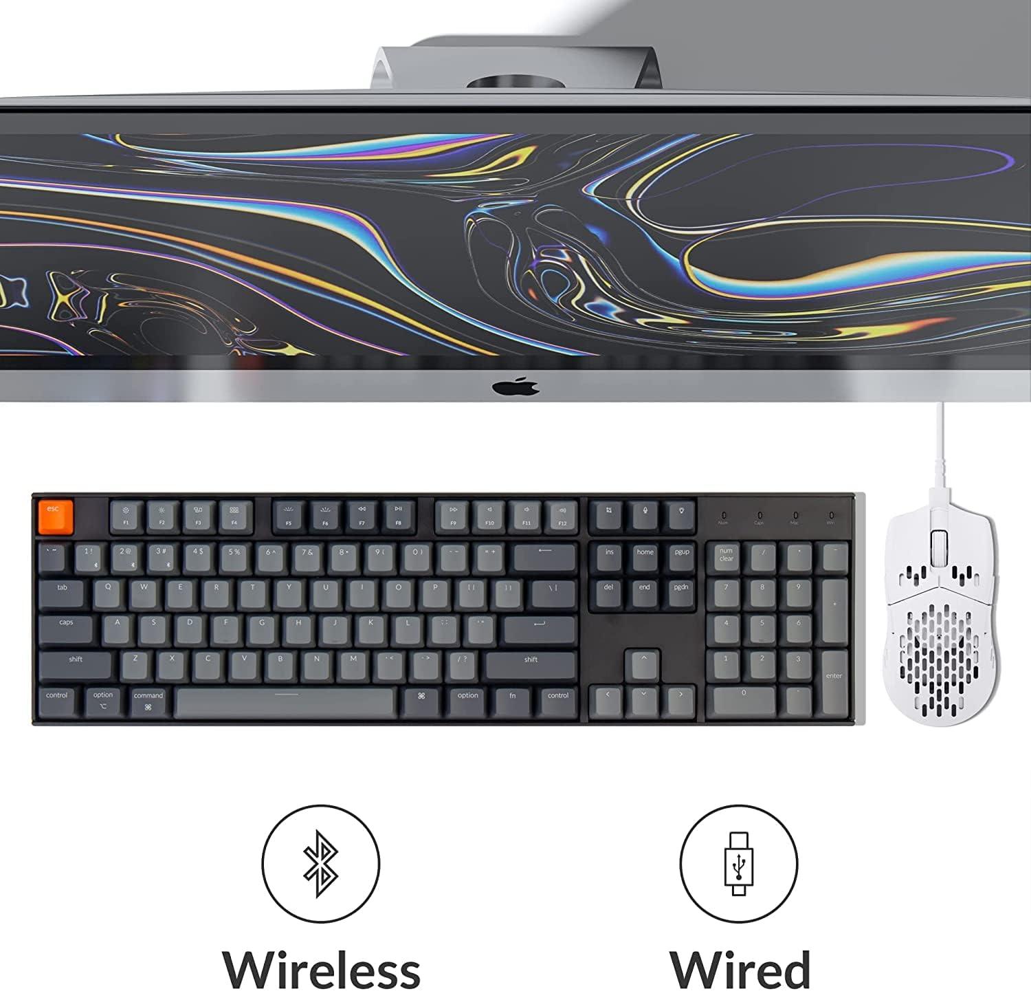 Keychron K10 is a full size layout (104-key) White backlight Bluetooth mechanical keyboard. The K10 is crafted to maximize your workspace and enhance productivity.The hot-swappable mechanical switches offers the freedom to easily personalize your typing experience without soldering.