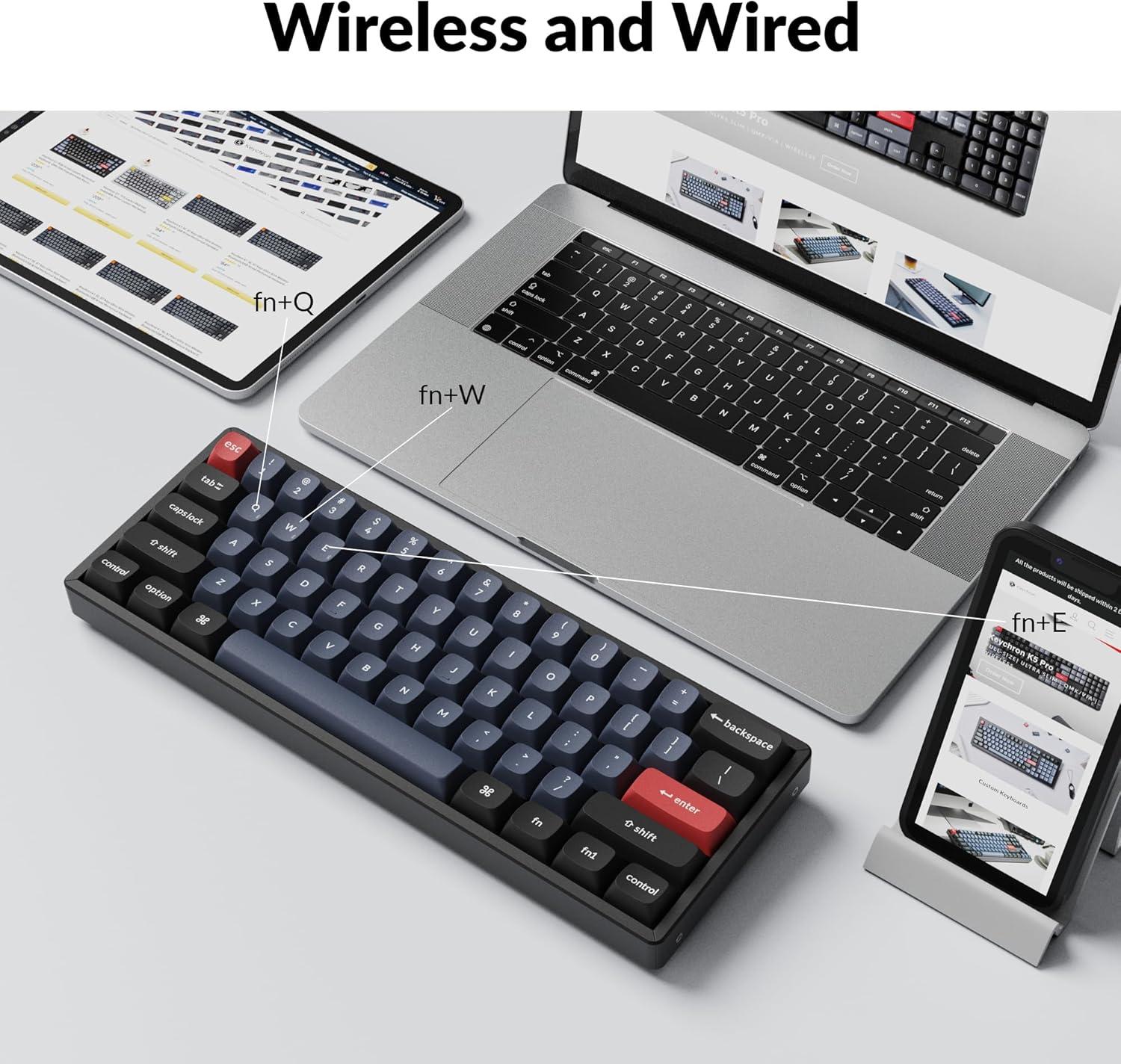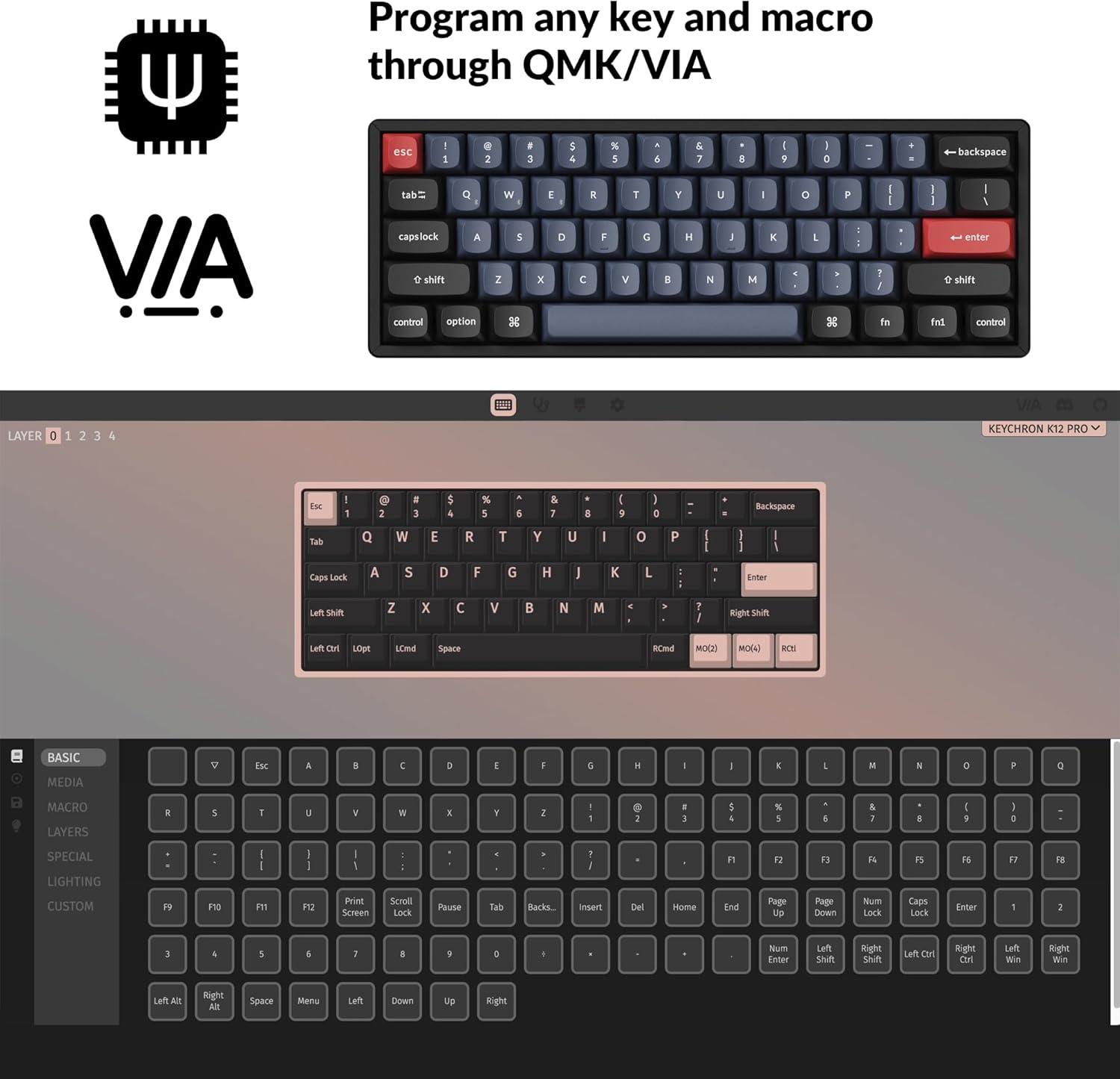 Program any Key with QMK/VIA: Anyone can master any keys, macro commands or combination keys through VIA with ease. Simply connect the K12 Pro to your device with a cable, drag and drop your favorite keys or macro commands to remap any key you want on any system (macOS, Windows, or Linux). *Note: User can remap a key on wired mode only. Once it's done, the keymap will work on both wireless and wired modes.