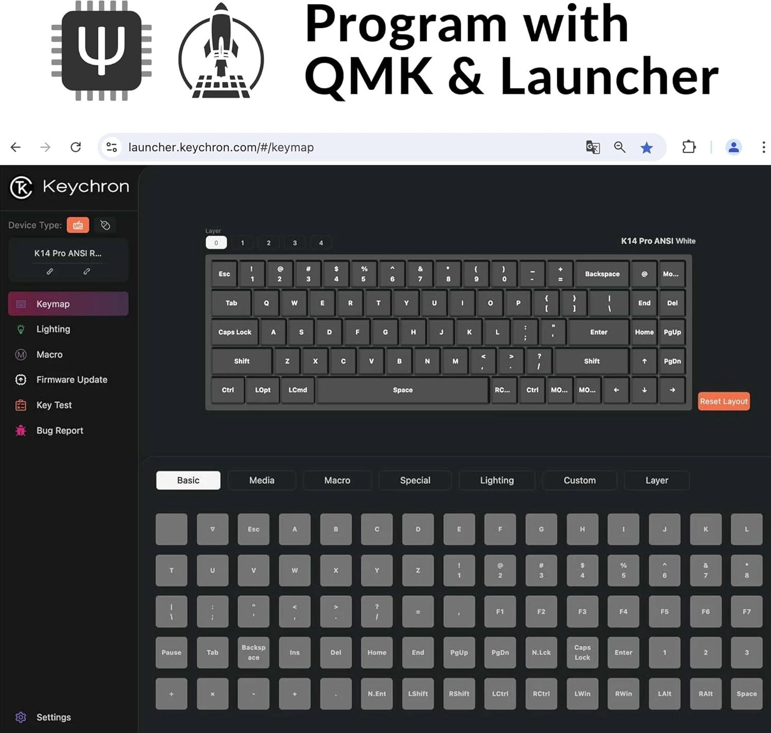 QMK/VIA Programmable: Keychron K14 Pro allows anyone to remap any key, and create macro commands, shortcuts, or combination keys through VIA. Simply connect the K14 Pro to your device with a cable, drag and drop your favorite keys or macro commands to remap any key you want on any system (macOS, Windows, or Linux). Note: User can remap a key on wired mode only. Once it's done, the keymap will work on both wireless and wired modes.