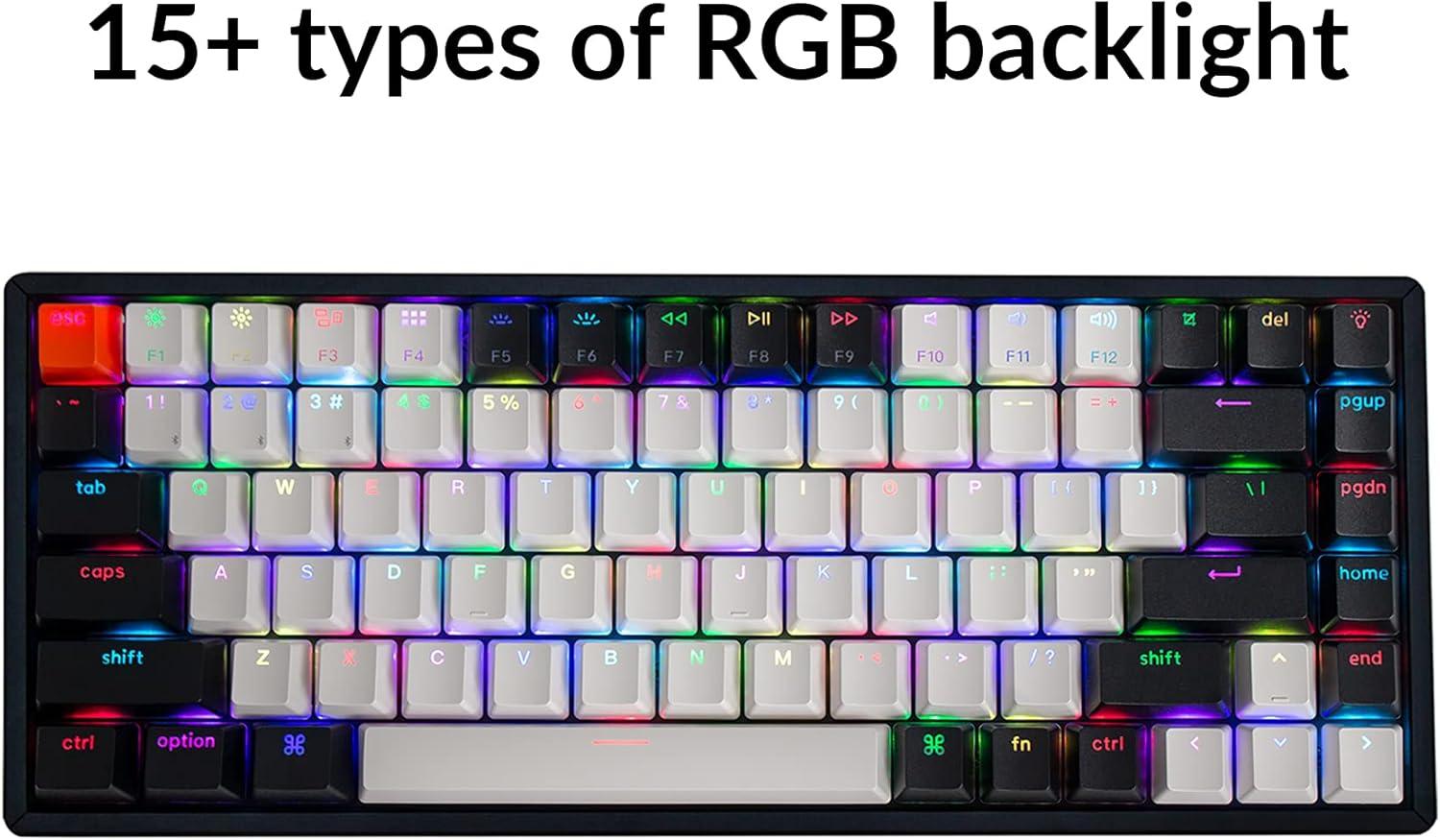 Keychron K2, a 75% layout 84 keys RGB backlight aluminum frame wireless mechanical keyboard giving you all the keys and function you need while keeping it compact. And let you personalize per-key typing experience without soldering, just pop them in and it’s done.
