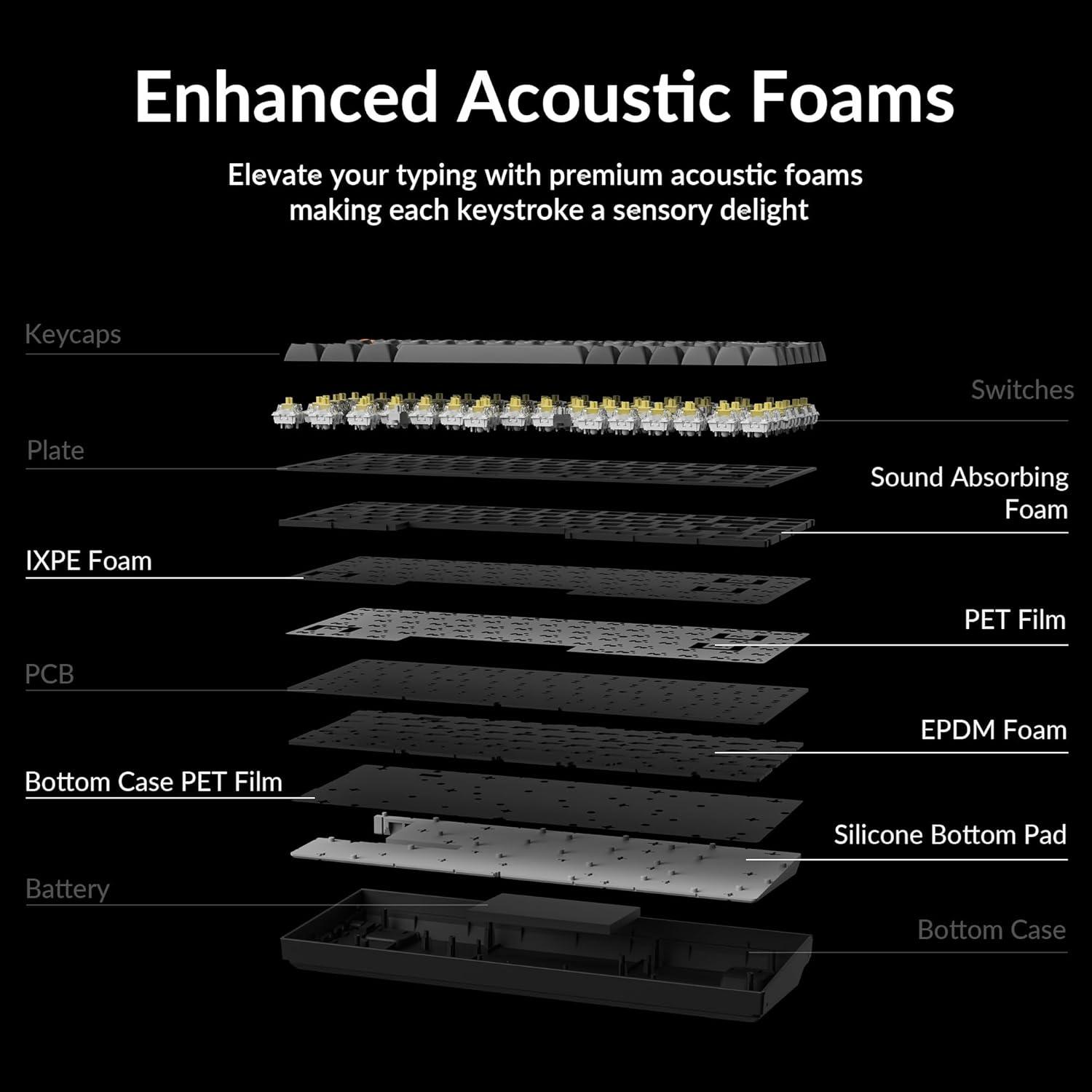 Enhanced Acoustic Foams: Enjoy a premium typing experience with advanced IXPE foam for comfort and durable EDPM foam for key switch support. The steel plate ensures responsive feedback and quiet typing, while the added weight boosts overall keyboard stability.