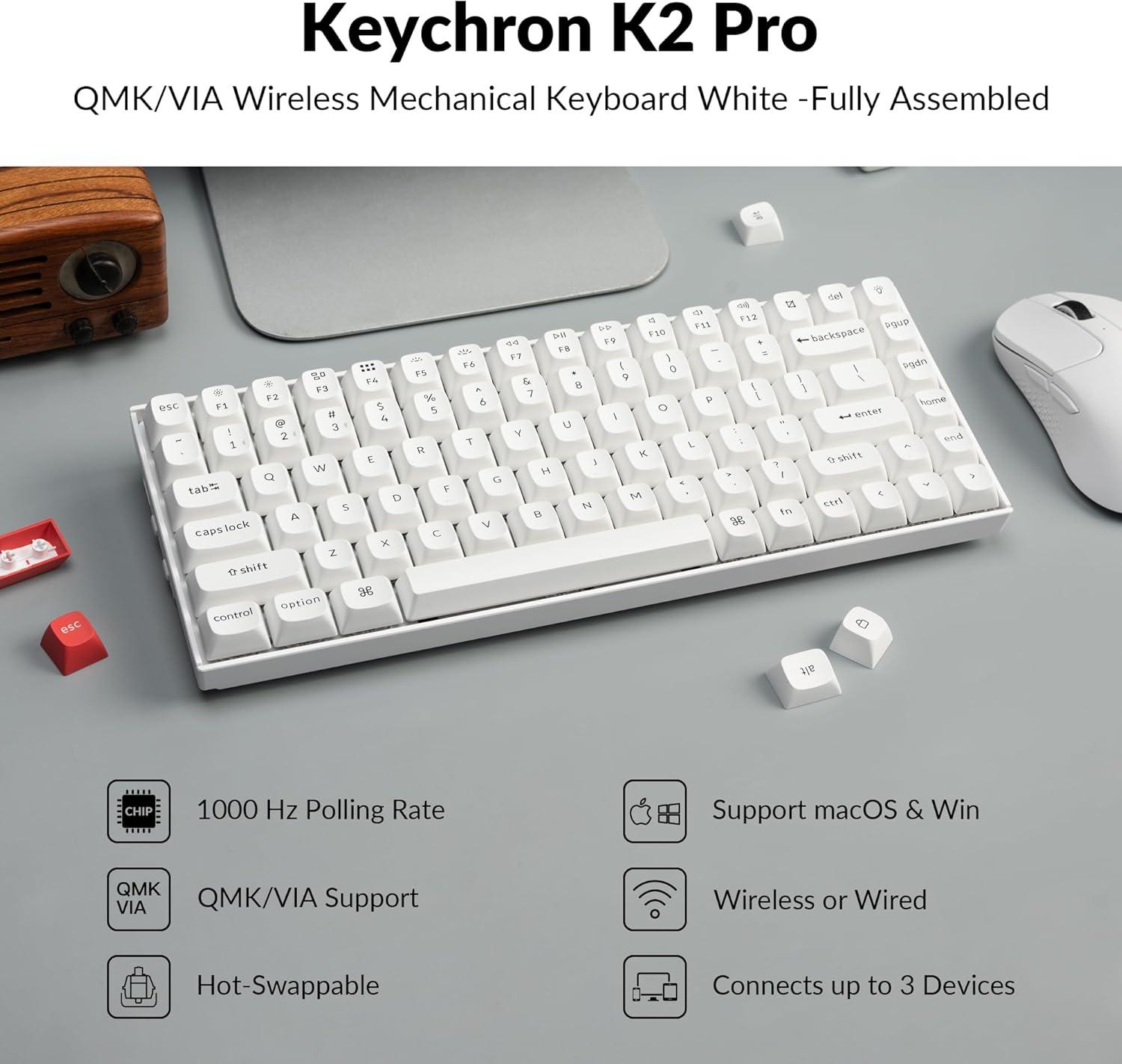 Hot-Swappable Keychron K Pro Red Switch: The hot-swappable sockets are mounted on the PCB, so you can hot-swap every switch on the K2 Pro with almost all of the 3pin and 5pin MX style mechanical switches on the market (including Cherry, Gateron, Kailh, Panda, etc.) without soldering. Pre-installed the pre-lubed Keychron K Pro mechanical red switch providing linear responsiveness with up to 50 million keystroke lifespan.