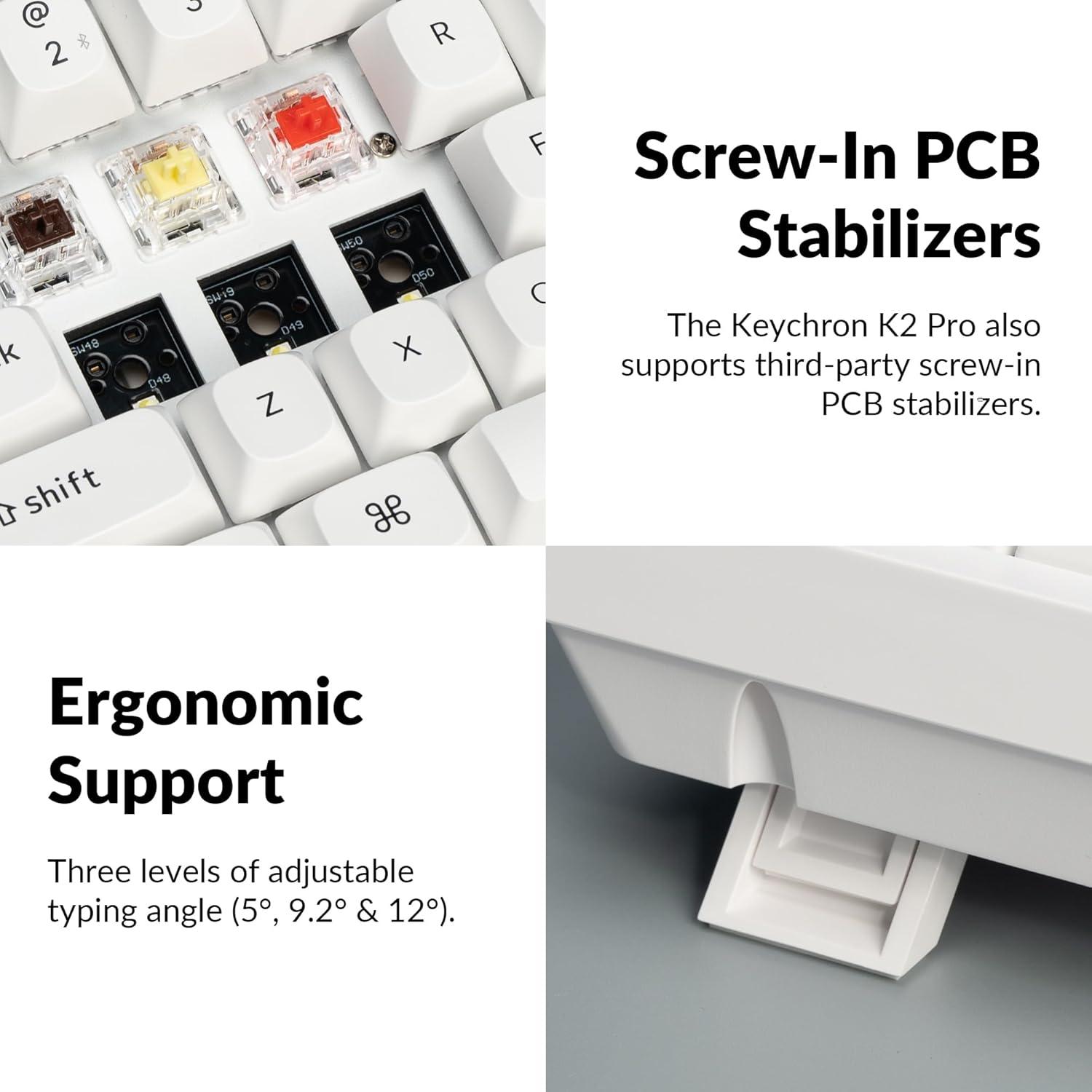 Upgraded Typing Experience – The added sound-absorbing foam, a thick silicone dampening bottom pad, and steel plate provide responsive feedback and a peaceful typing sound, while added weight will enhance the stability. We’ve integrated the PCB-mounted screw-in stabilizers for a smoother typing experience with less wobbliness on the big keys such as space bar, shift, enter, and backspace. The Keychron K2 Pro also supports third-party screw-in PCB stabilizers.