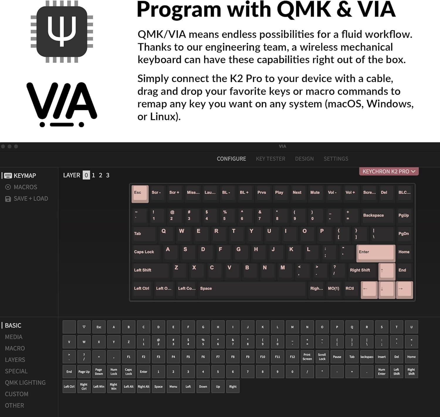 QMK & VIA support: Simply connect the K2 Pro to your device with a cable, drag and drop your favorite keys or macro commands to remap any key you want on any system (macOS, Windows, or Linux).