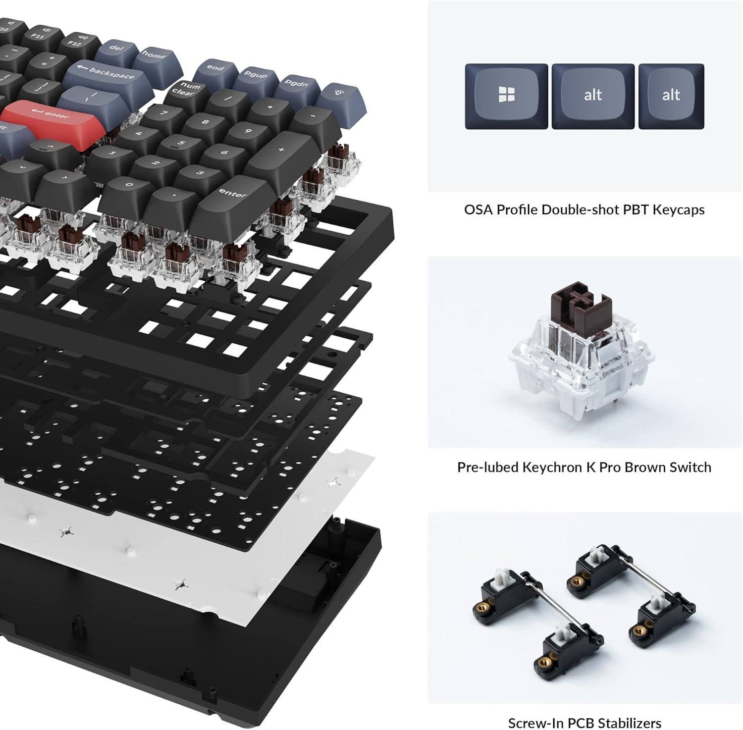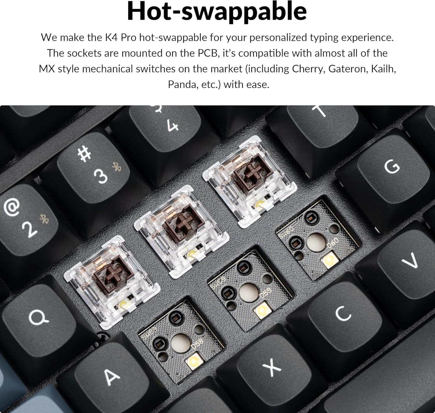 Hot-swappable – The hot-swappable sockets are mounted on the PCB, so you can hot-swap every switch on the K4 Pro with almost all of the 3pin and 5pin MX style mechanical switches on the market (including Cherry, Gateron, Kailh, Panda, etc.) without soldering. You can customize your own typing experience in seconds. Also integrated the PCB-mounted screw-in stabilizers for a smoother typing experience with less wobbliness on the big keys such as space bar, shift, enter, and backspace. The Keychron K4 Pro also supports third-party screw-in PCB stabilizers.