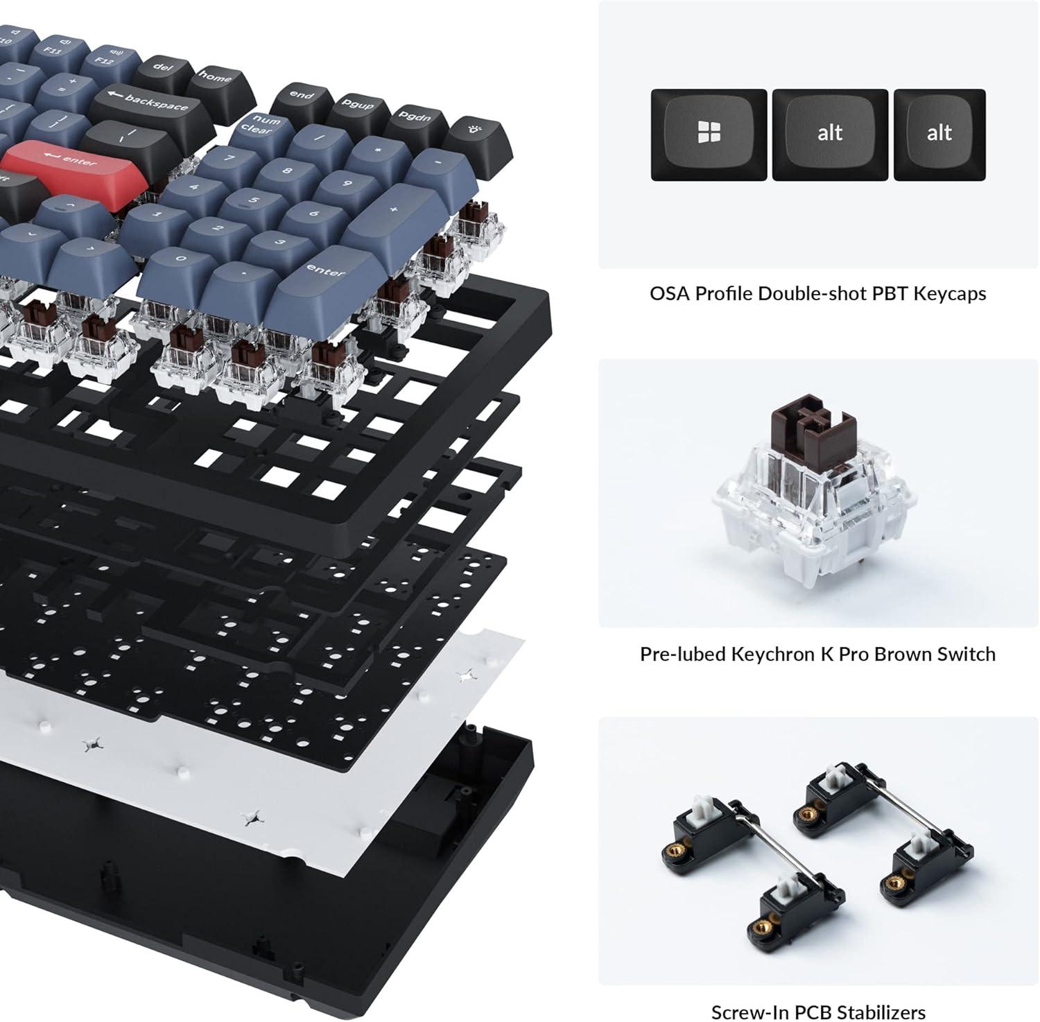 Hot-swappable: The hot-swappable sockets are mounted on the PCB and compatible with almost all the MX style 3pin and 5pin mechanical switches on the market (including Gateron, Cherry, Kailh, etc.), you can install or change the switches without soldering. Pre-installed the pre-lubed Keychron K Pro brown switch providing unrivaled tactile responsiveness.