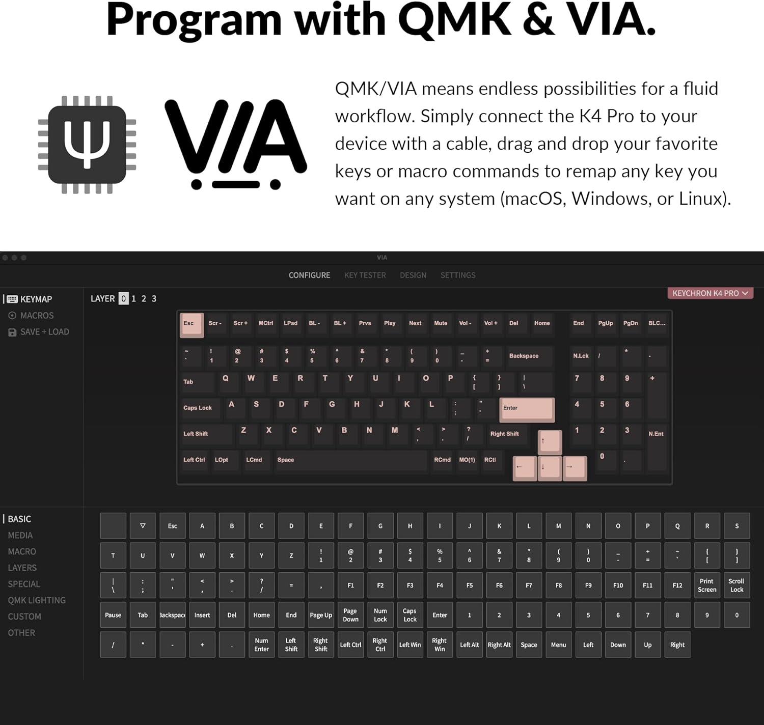 With full QMK and VIA support: Simply connect the K4 Pro to your device with a cable, drag and drop your favorite keys or macro commands to remap any key you want on any system (macOS, Windows, or Linux).