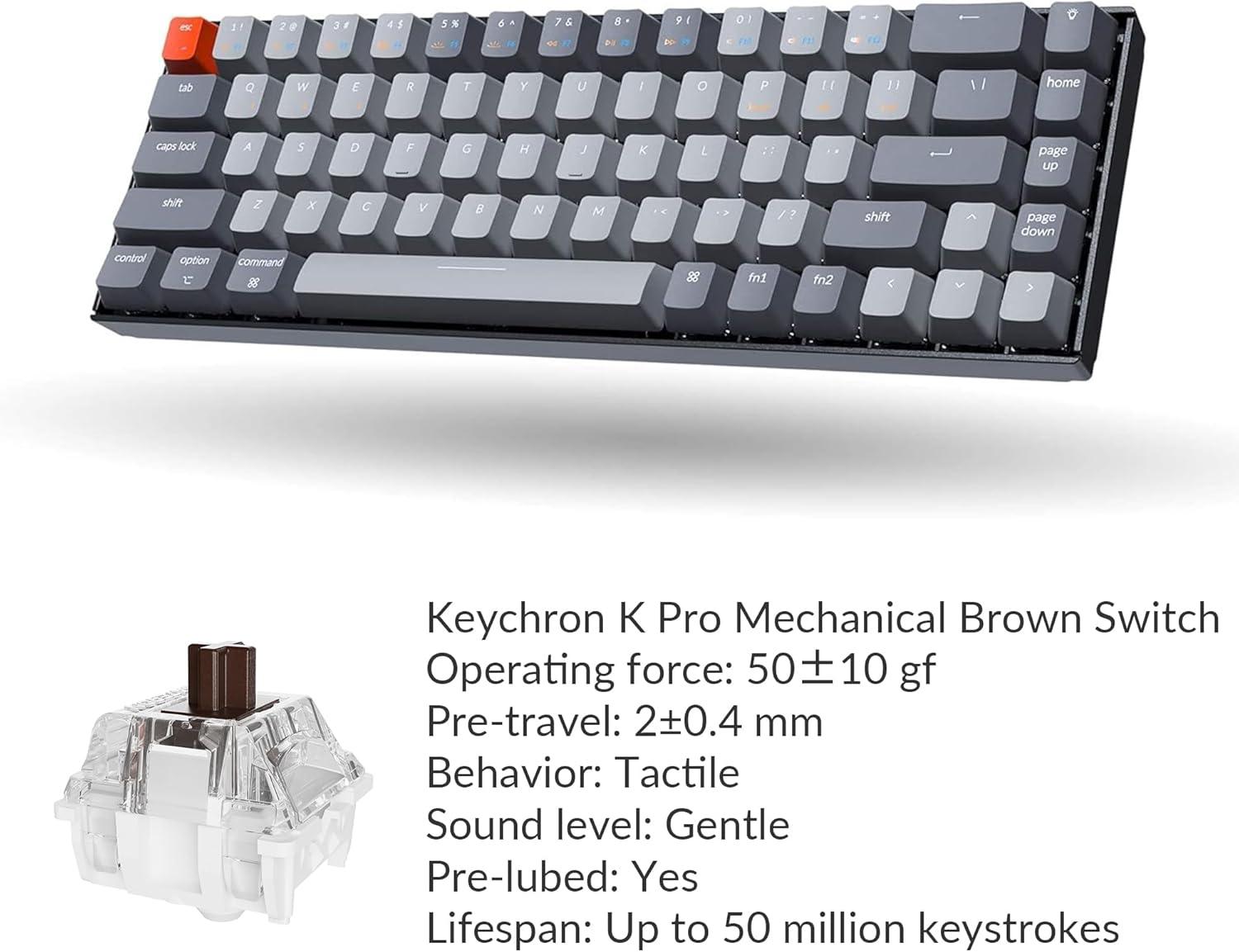 With the Keychron K Pro Brown Switch providing unrivaled tactile responsiveness on the Brown switch with a durable 50 million keystroke lifespan. N-key rollover (NKRO) on wired mode or 6KRO on wireless mode.