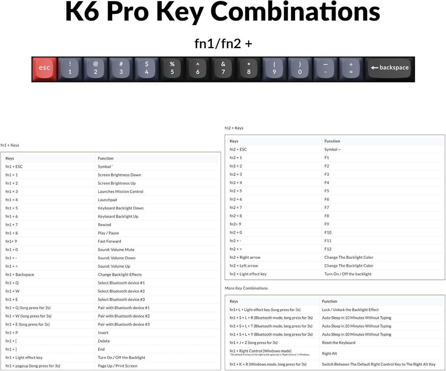 Program keys with Launcher- Anyone can master any keys, macro commands or combination keys through Launcher web app with ease. Simply connect the K6 Pro to your device with a cable, drag and drop your favorite keys or macros to remap any key you want on any system (macOS, Windows, or Linux). *Note: User can remap a key on wired mode only. Once it's done, the keymap will work on both wireless and wired modes.