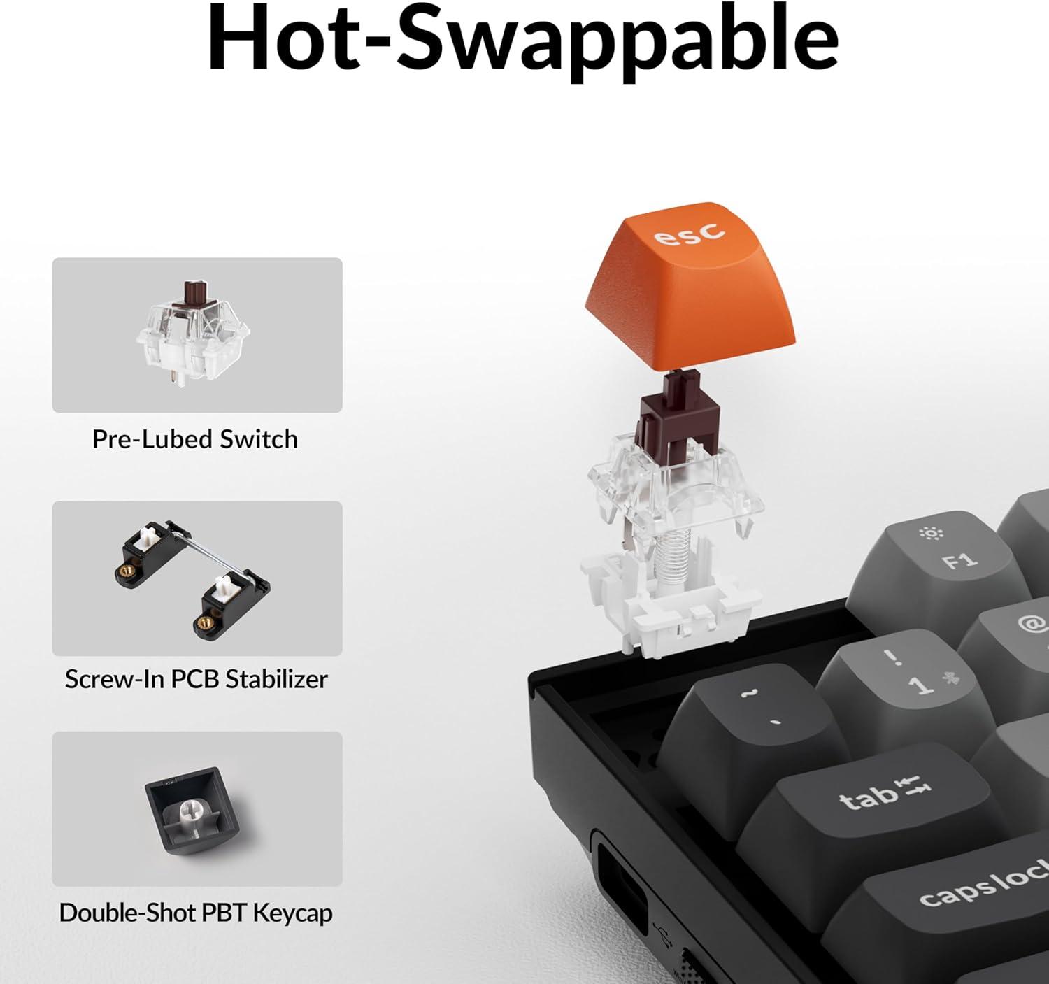 Hot-Swappable Switches – Personalize your typing experience effortlessly! The Keychron K8 Max allows you to hot-swap every switch with almost any 3-pin or 5-pin MX-style mechanical switch (including Cherry, Gateron, Kailh, Panda, etc.)—all without soldering, for instant customization.