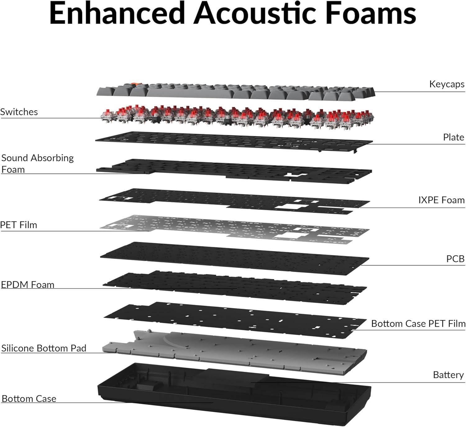 Upgraded Typing Experience – Equipped with IXPE acoustic foam, EPDM foam, and a steel plate for comfort, responsiveness, and durability. The added weight enhances stability while providing satisfying feedback and a quieter typing sound.