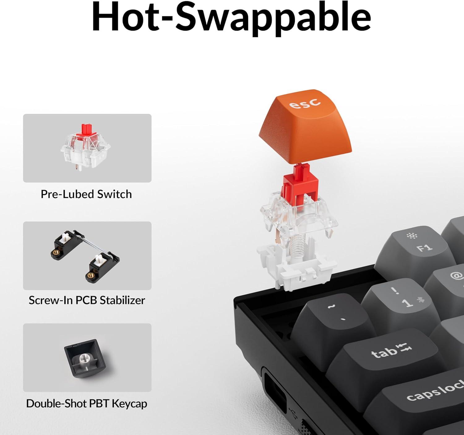Hot-Swappable Switches – Personalize your typing experience effortlessly! The Keychron K8 Max allows you to hot-swap every switch with almost any 3-pin or 5-pin MX-style mechanical switch (including Cherry, Gateron, Kailh, Panda, etc.)—all without soldering, for instant customization.
