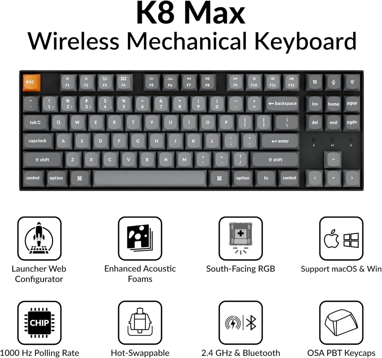 The K8 Max is a wireless mechanical keyboard with a TKL (80%) layout. It supports 2.4 GHz, Bluetooth, and wired connections. Configurable through QMK and Keychron Launcher web app, it offers endless possibilities and enhanced productivity in your work and gaming!