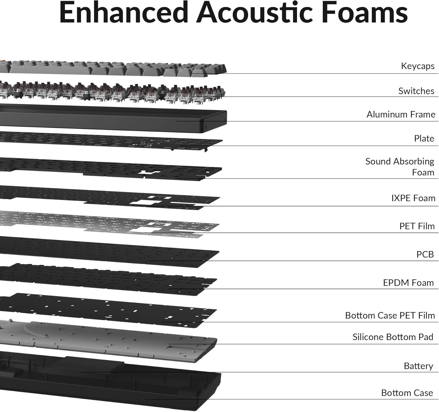 Satisfying Typing Sound – Featuring advanced IXPE acoustic foam for enhanced comfort, coupled with resilient EPDM foam for superior key support and durability. The steel plate provides responsive feedback and a peaceful typing sound, while added weight in the aluminum frame will enhance the stability.