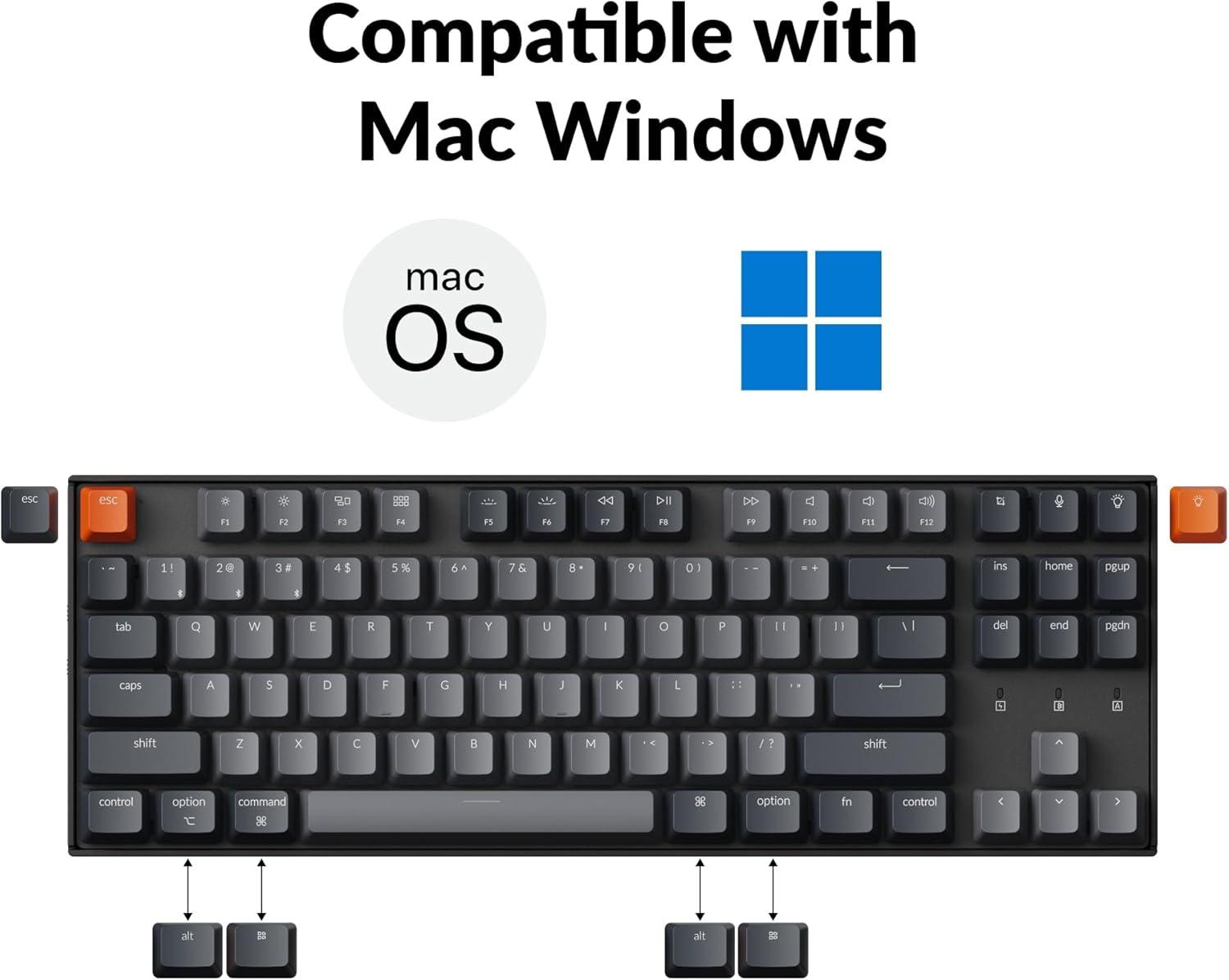 With a unique Mac layout while compatible with Windows, the Keychron K8 has all essential multimedia and function keys you need. Extra keycaps for both Windows and Mac operating systems are included.