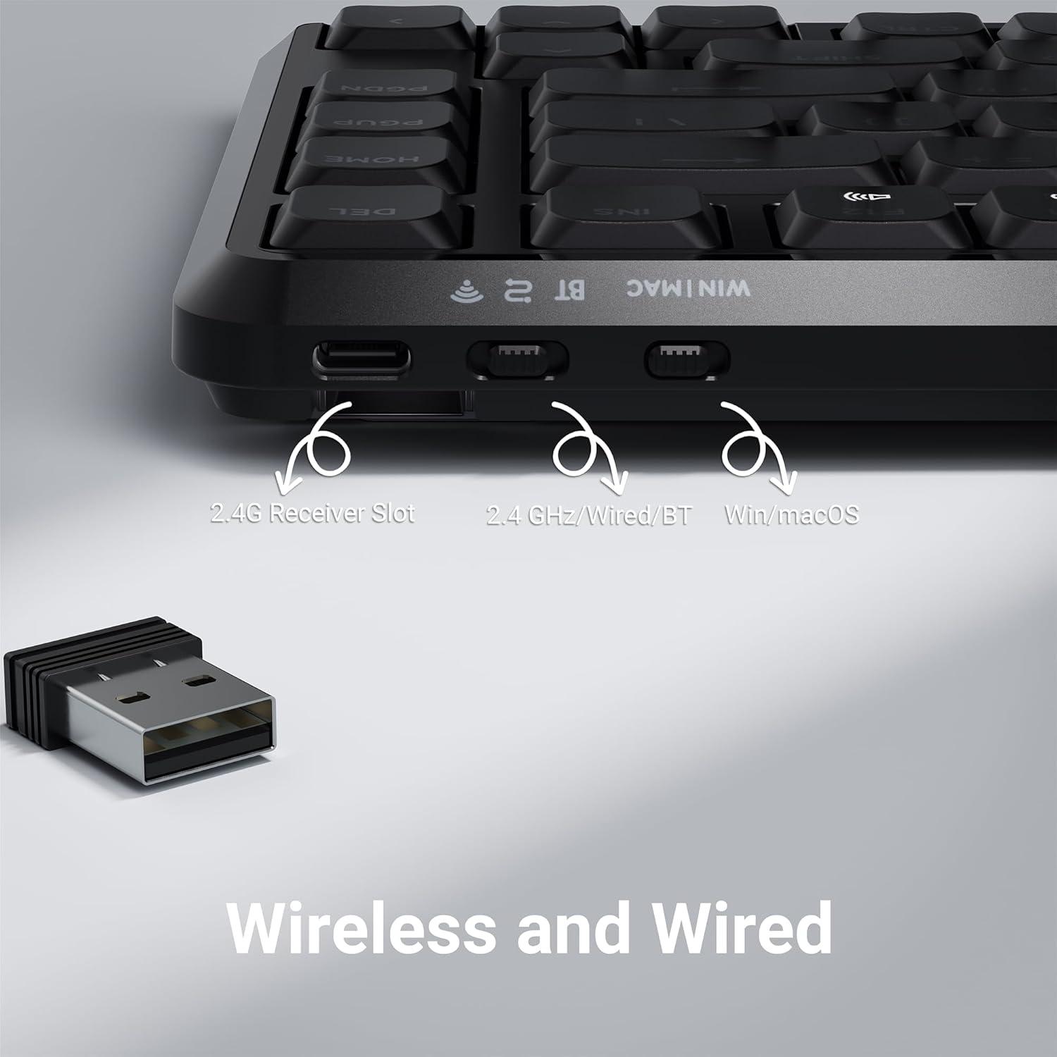 2.4G, Bluetooth 5.2, and Wired Modes: Switch seamlessly between three connection modes. Connect up to three devices via Bluetooth 5.2, or use the 2.4 GHz wireless or Type-C wired modes for stable, high-speed performance across setups