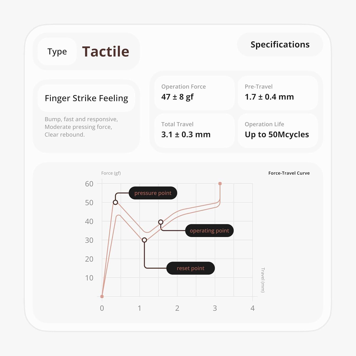 The Keychron Low Profile Brown switch features a tactile bump with an operating force of 47±8gf, a pre-travel distance of 1.7±0.4 mm, and a total travel of 3.1±0.3 mm. With a lifespan of up to 50 million keystrokes, it provides a responsive feel, moderate pressing force, and a clear tactile rebound.