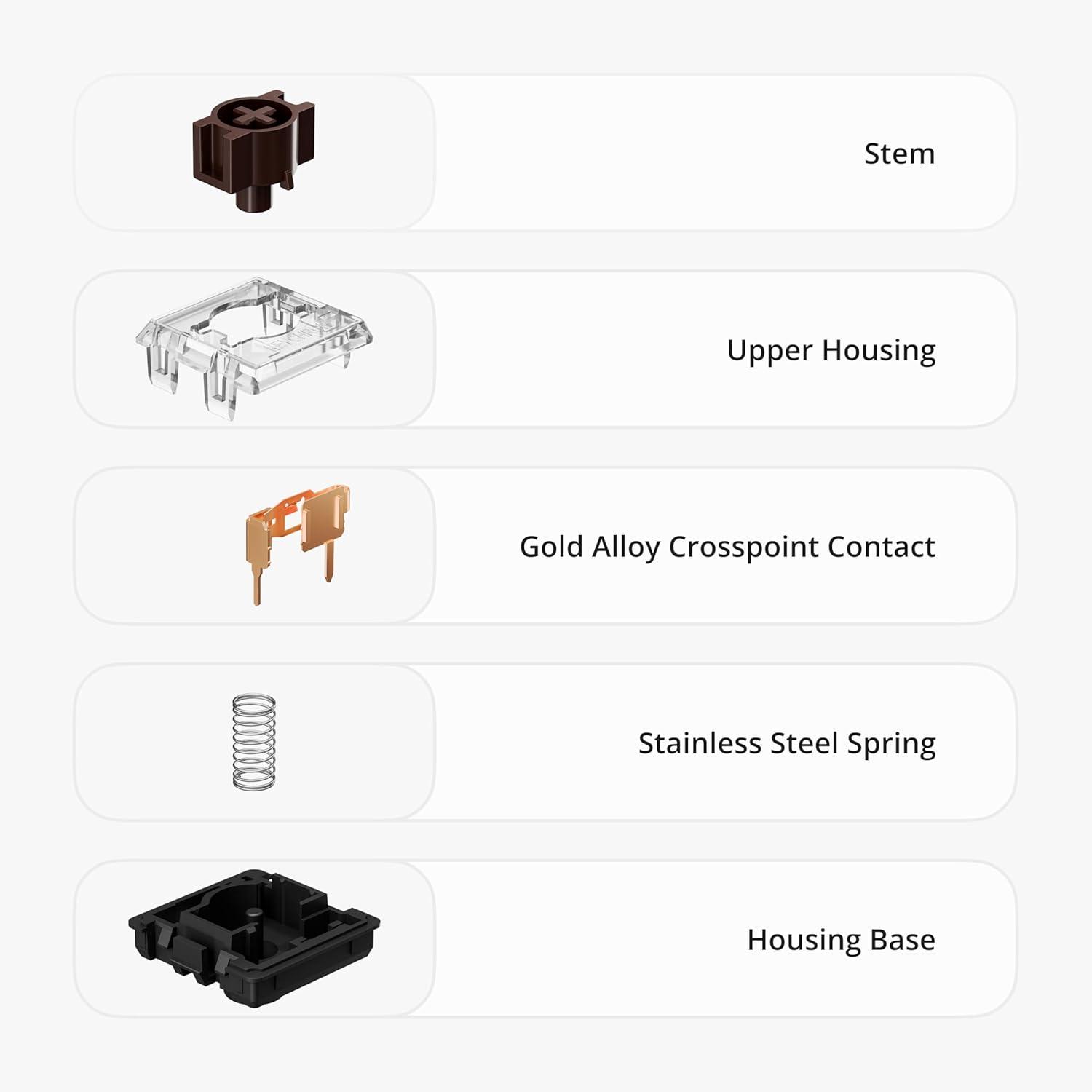 Unique Dustproof Wall Structure: The MX-styled stem is designed with a unique dust wall structure to resist the intrusion of dust and reduce the stem wobbliness, which ensures a more stable typing feeling. It is also compatible with most low-profile keycaps with MX-style design.