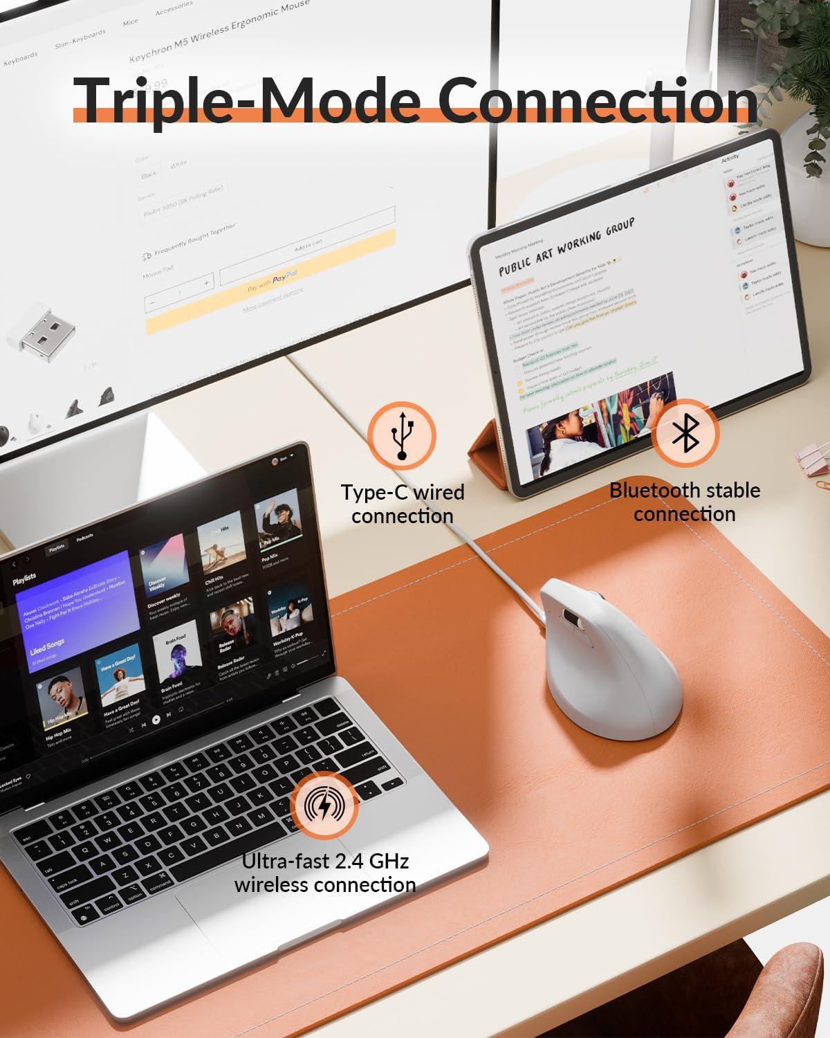 Keychron M5 8K Vertical Ergonomic Mouse Wireless, 2.4 GHz/Bluetooth 5.3/Wired Computer Mice Rechargeable, 5 Levels Up to 30K DPI with Programmable Buttons for Laptop macOS/Windows – Black(White)