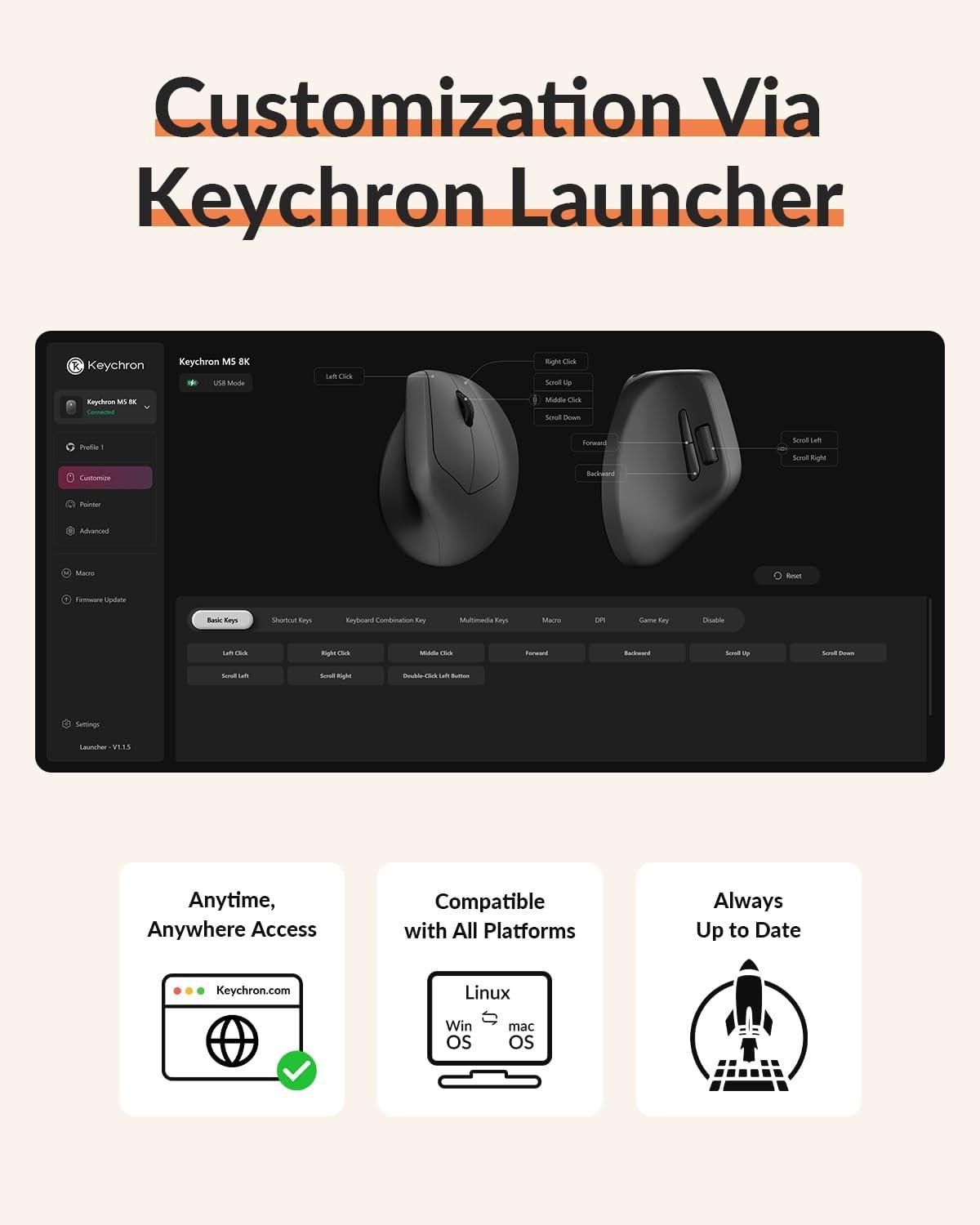 Customization Via Keychron Launcher: The online Launcher web app allows for easy personalization. You can modify keys, set shortcuts, create dedicated macros, or do professional settings for LOD, polling rate, DPI, etc. Besides, it provides 5 on-board memory profiles for your access to different apps or computers