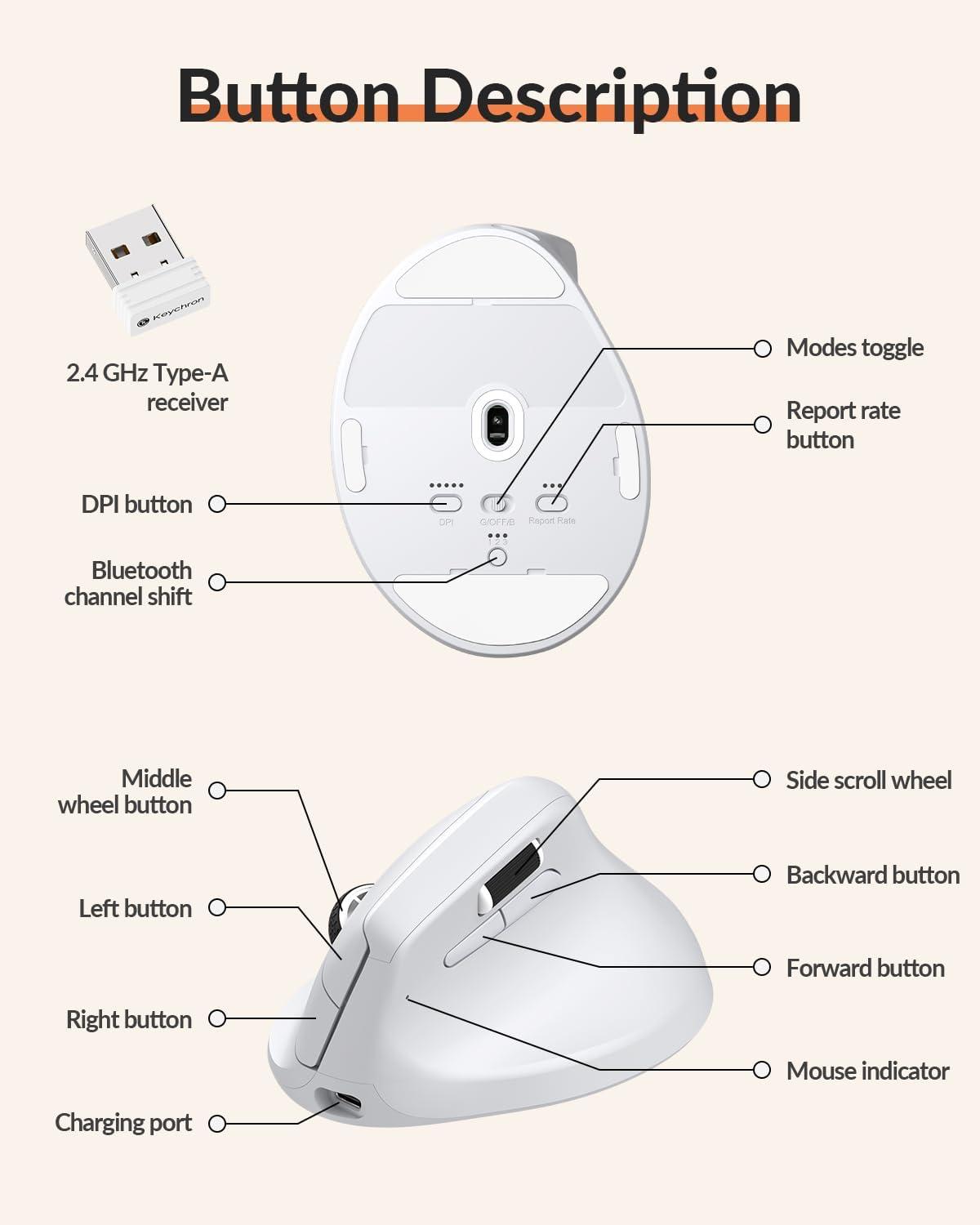Keychron M5 8K Vertical Ergonomic Mouse Wireless, 2.4 GHz/Bluetooth 5.3/Wired Computer Mice Rechargeable, 5 Levels Up to 30K DPI with Programmable Buttons for Laptop macOS/Windows - Black(White)