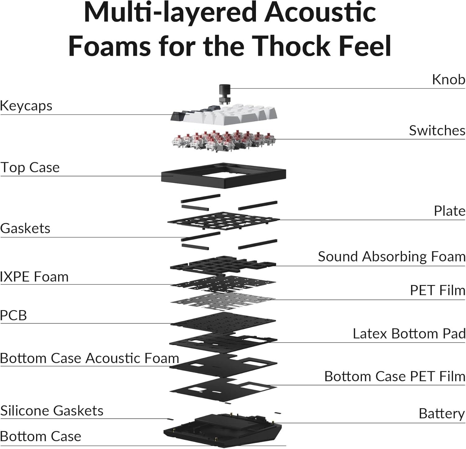 Enhanced Thock Feel – Added a combination of premium acoustic foams such as IXPE, PET, and Latex. Together with our double-gasket design, screw-in stabilizers, and more. Each keystroke has become more enjoyable.