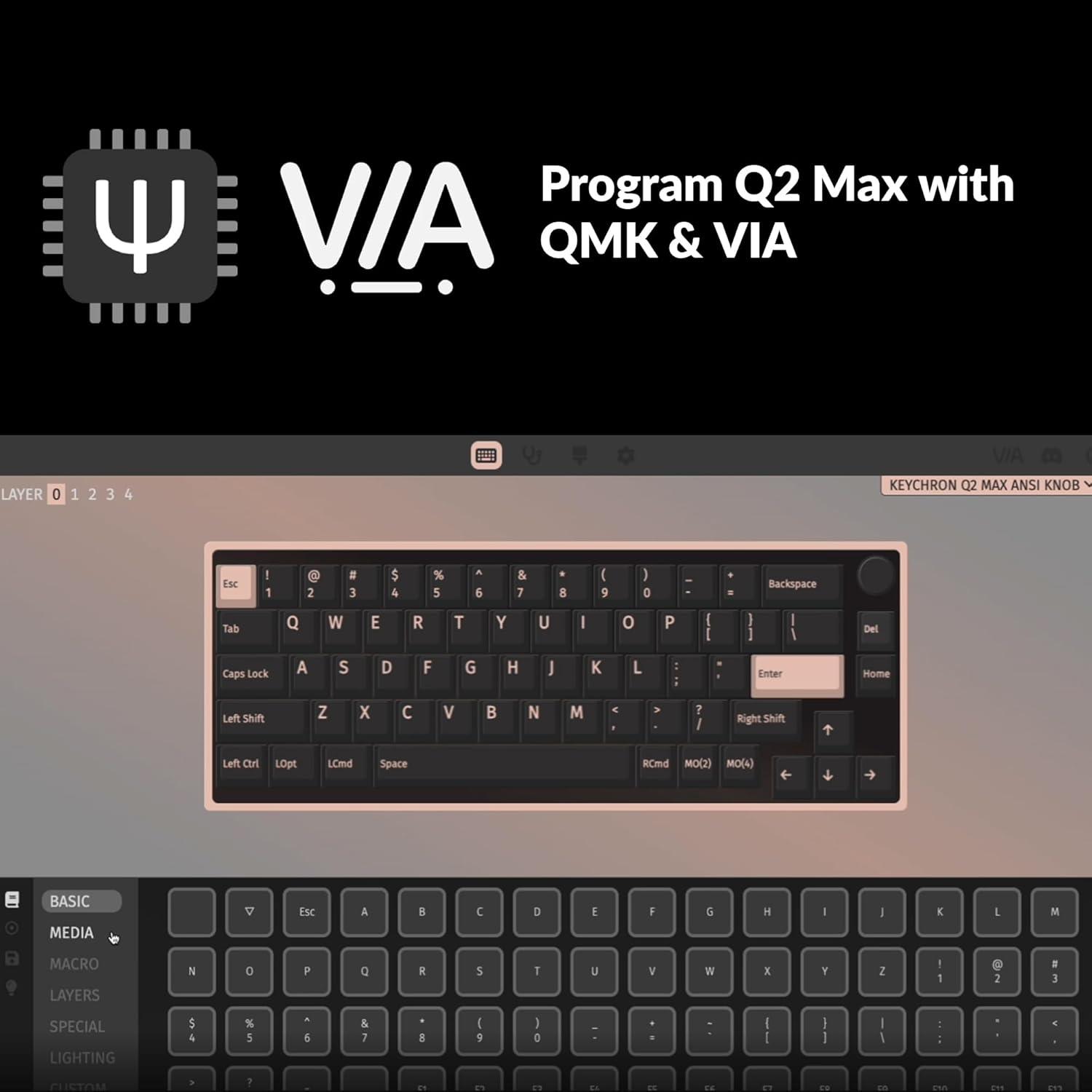 Program the Q2 Max with QMK/VIA – QMK / VIA is open-source software for keyboards that allows anyone to easily program and remap each key or macro (incl. the knob) on macOS, Windows, or Linux. Please download the appropriate keymap JSON file, open VIA, turn on “Show Design tab” on “Settings” tab, and drag the JSON file into the “Design” tab on VIA to get it works on VIA.