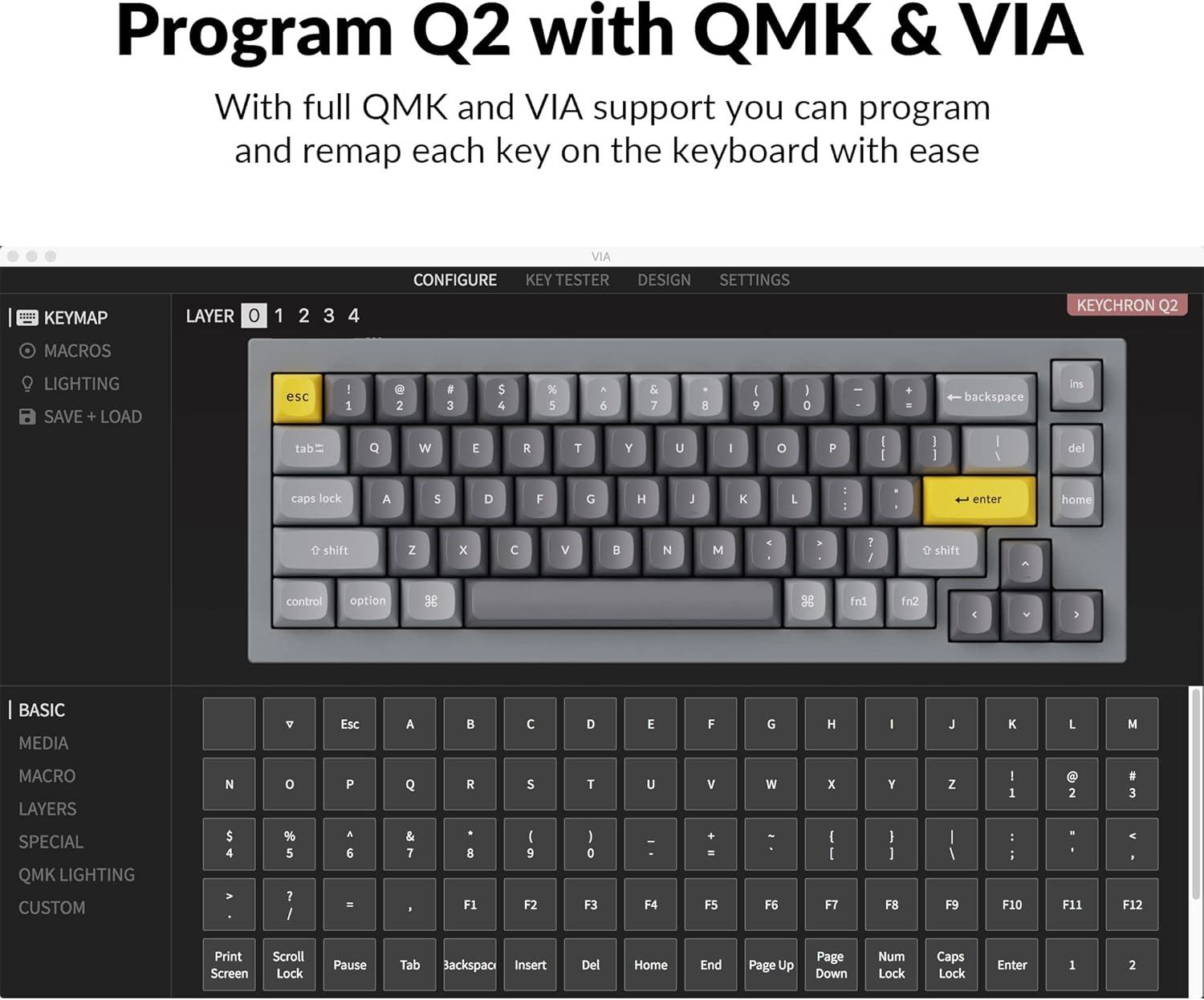 With full QMK and VIA support, you can program and remap each key on the keyboard with ease. Simply connect the Q2 to your device with a cable, import the Q2 keymap JSON file into the VIA software, drag and drop your favorite keys or macro commands to remap any key you want on macOS, Windows, or Linux operating system. Check our user guide or user manual for more instructions.