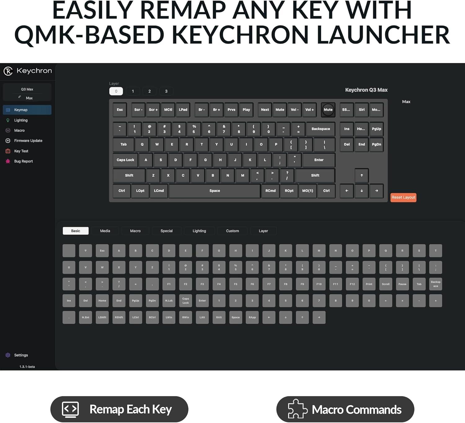Remap with Keychron web app: Simply connect the Q3 Max to your device with a cable, open the Keychron Launcher web app, drag and drop your favorite keys or macro commands to remap any key on any system (macOS, Windows, or Linux) for a fluid workflow. Or create your keymap with open-sourced QMK firmware.
