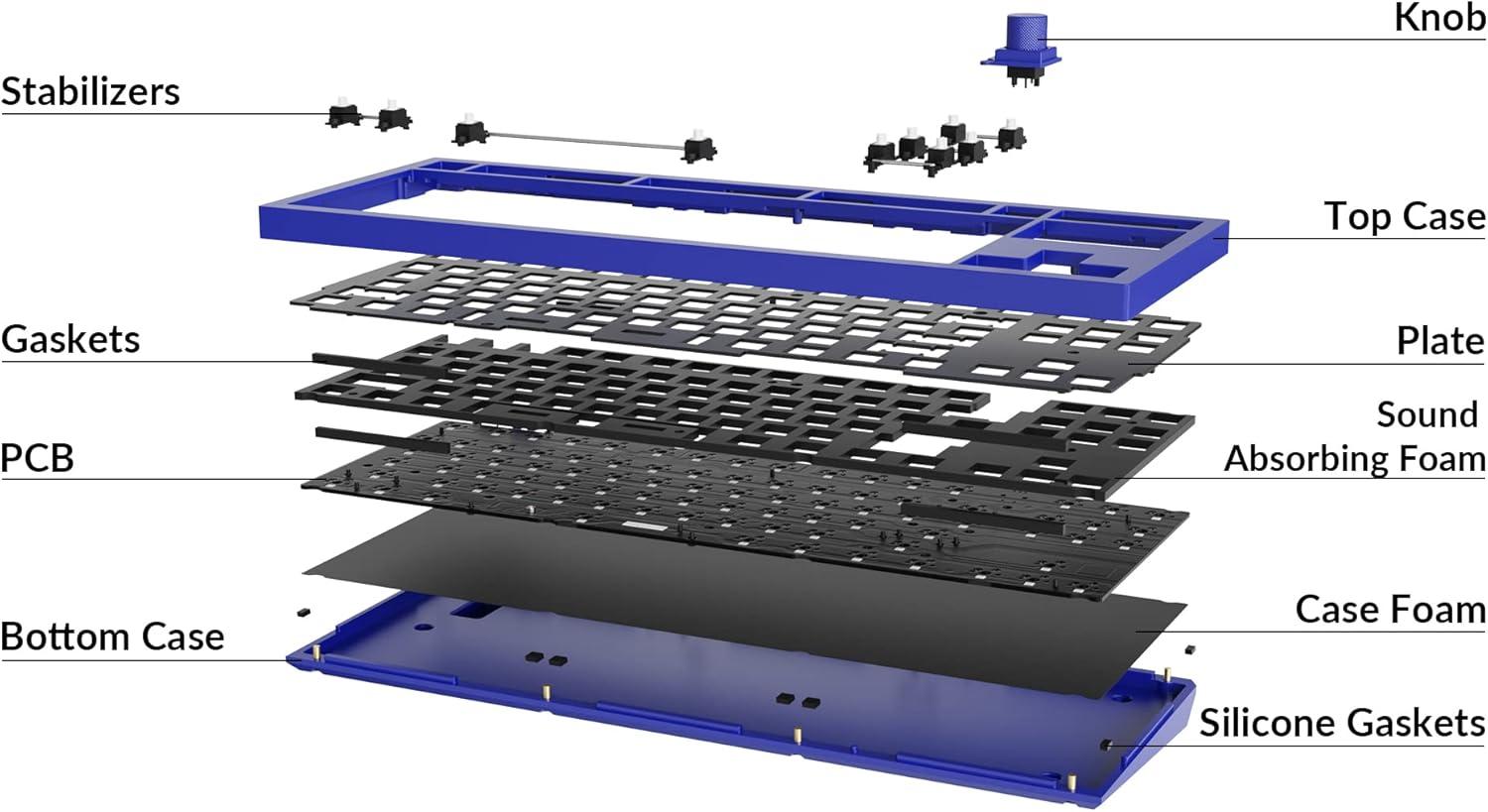 Hot-swappable: The hot-swappable sockets are compatible with almost all the MX style 3pin and 5pin mechanical switches on the market (including Gateron, Cherry, Kailh, etc.). , you can hot-swap the Q3 Barebone Knob version without soldering. The big keys’ (space bar, shift, enter, delete) typing experience is now more stable and smooth with the new screw-In PCB stabilizers.