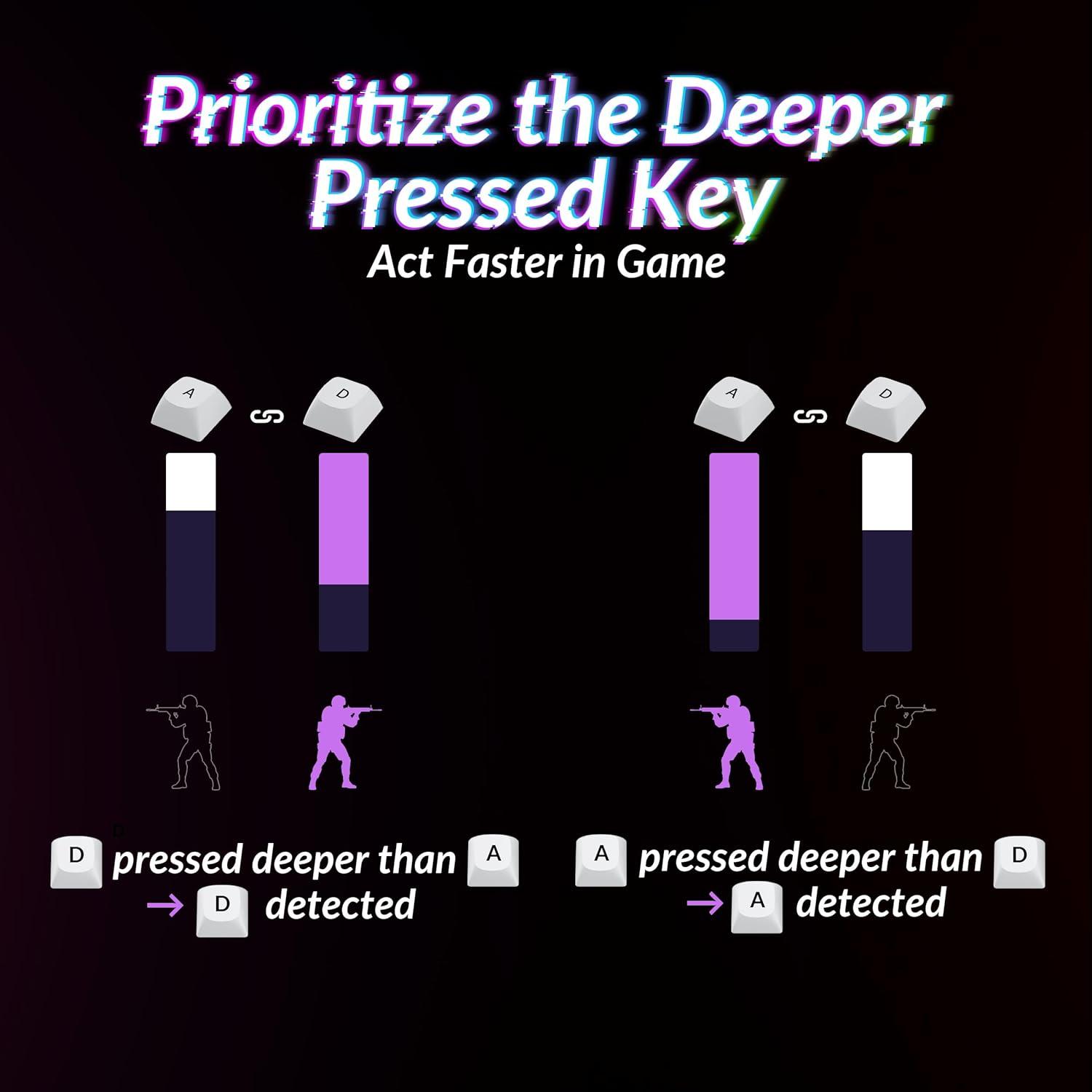Gateron Double-Rail Magnetic Switch: Engineered with a dual-rail structure and pre-lubed for stability and smoothness, these switches feature a magnetic sensor with 0.1 mm sensitivity. Customize actuation points and assign actions per key travel depth for a tailored typing experience.