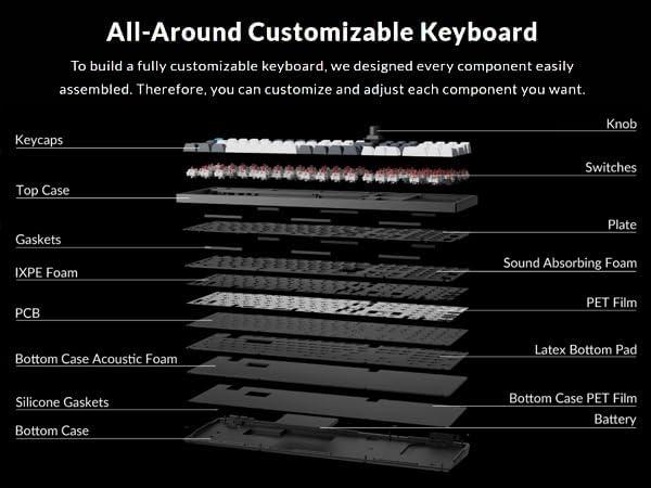 Hot-swappable – The hot-swappable sockets are compatible with almost all the MX style 3pin and 5pin mechanical switches on the market (including Gateron, Cherry, Kailh, etc.), you can hot-swap the Q6 Max version without soldering. The big keys'(space bar, shift, enter, delete) typing experience is now more stable and smooth with the new screw-In PCB stabilizers.