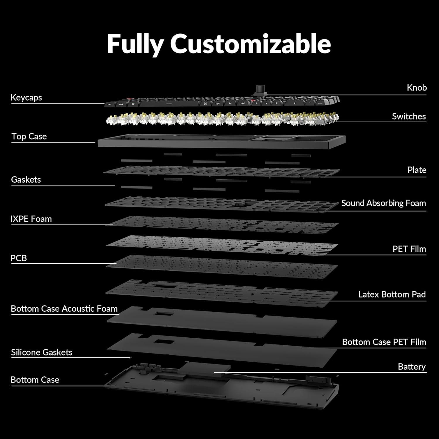 Program The Q6 Max with QMK & LAUNCHER – Its ability to remap any key, and create macro commands, shortcuts, or key combinations through the QMK/LUANCHER. You can hot-swap every switch on the Q6 Max with almost all of the 3pin and 5pin MX style mechanical switches on the market without soldering required.