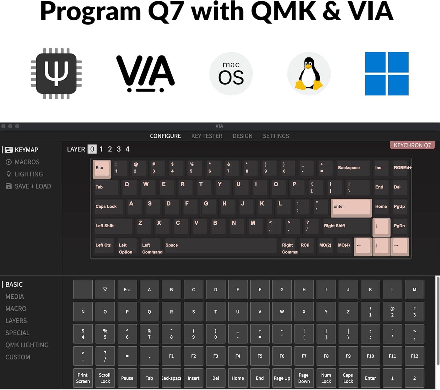 QMK and VIA Support: Keychron Q7 machanical keyboard fully supports QMK and VIA open-source firmware, enabling you to easily remap keys, create complex macros, and customize backlighting. It offers extensive personalization for your typing workflow and is compatible with Mac, Windows, and Linux.