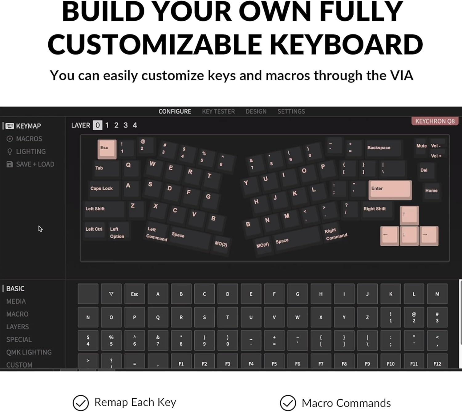 Ergonomic Design: Keychron Q8 is an all-metal mechanical keyboard with a 65% Alice layout. The keyboard is divided into left and right halves for balance, and the curved split key frame allows for more natural typing, working all day, reducing wrist fatigue and forearm muscle tension. With the aluminum CNC machined body, dual joint design and QMK/VIA support, the Q8 is designed for premium writing comfort.