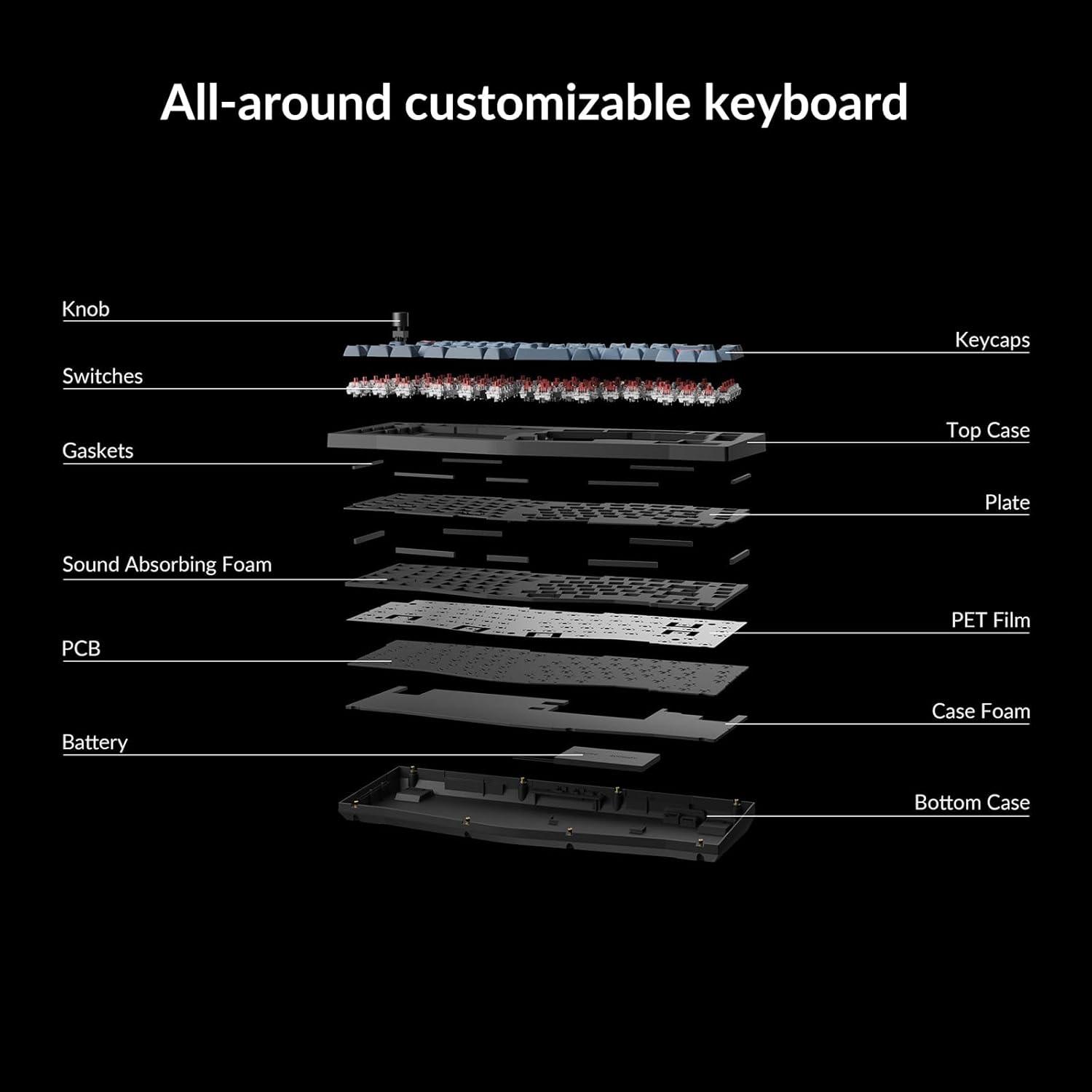 All-around customizable keyboard. To build a fully customizable keyboard, we designed every component to be easily assembled so you can customize and adjust any or every parts the way you want