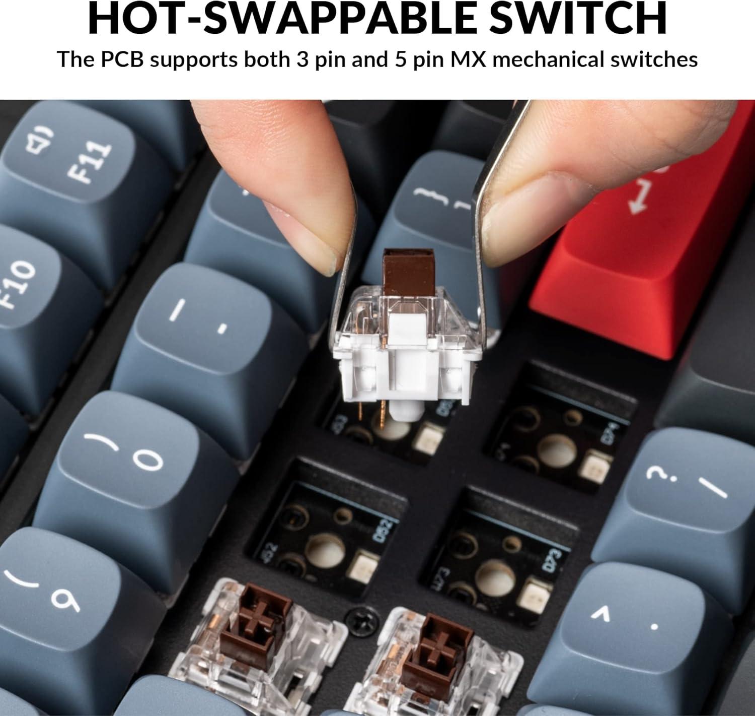 Hot-swappable Support: With the pre-lubed mechanical linear red switch provides unrivaled tactile responsiveness with up to 50 million keystroke lifespan. You can also hot-swap the V6 with almost all of the 3pin and 5pin MX mechanical switches on the market (including Cherry, Gateron, Kailh, Panda, etc.) without soldering required. The PCB-mounted screw-in stabilizer for “big keys” such as space bar, shift, enter, and delete are designed for less wobbliness and smooth performance.