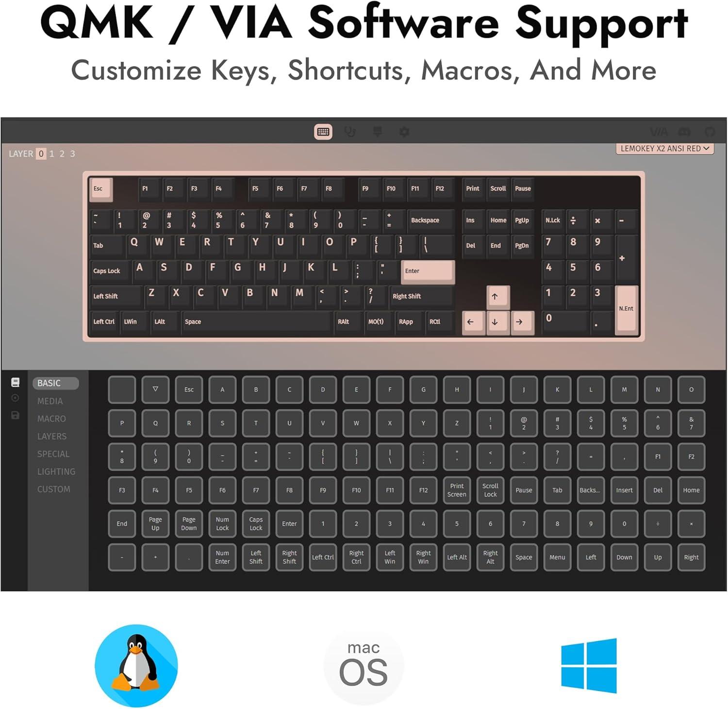 QMK/VIA software support: QMK / VIA is open-source software for keyboards that allows anyone to program and remap each key easily and quickly. You can personalize your own keyboard layouts, shortcuts, backlight effects, and more.